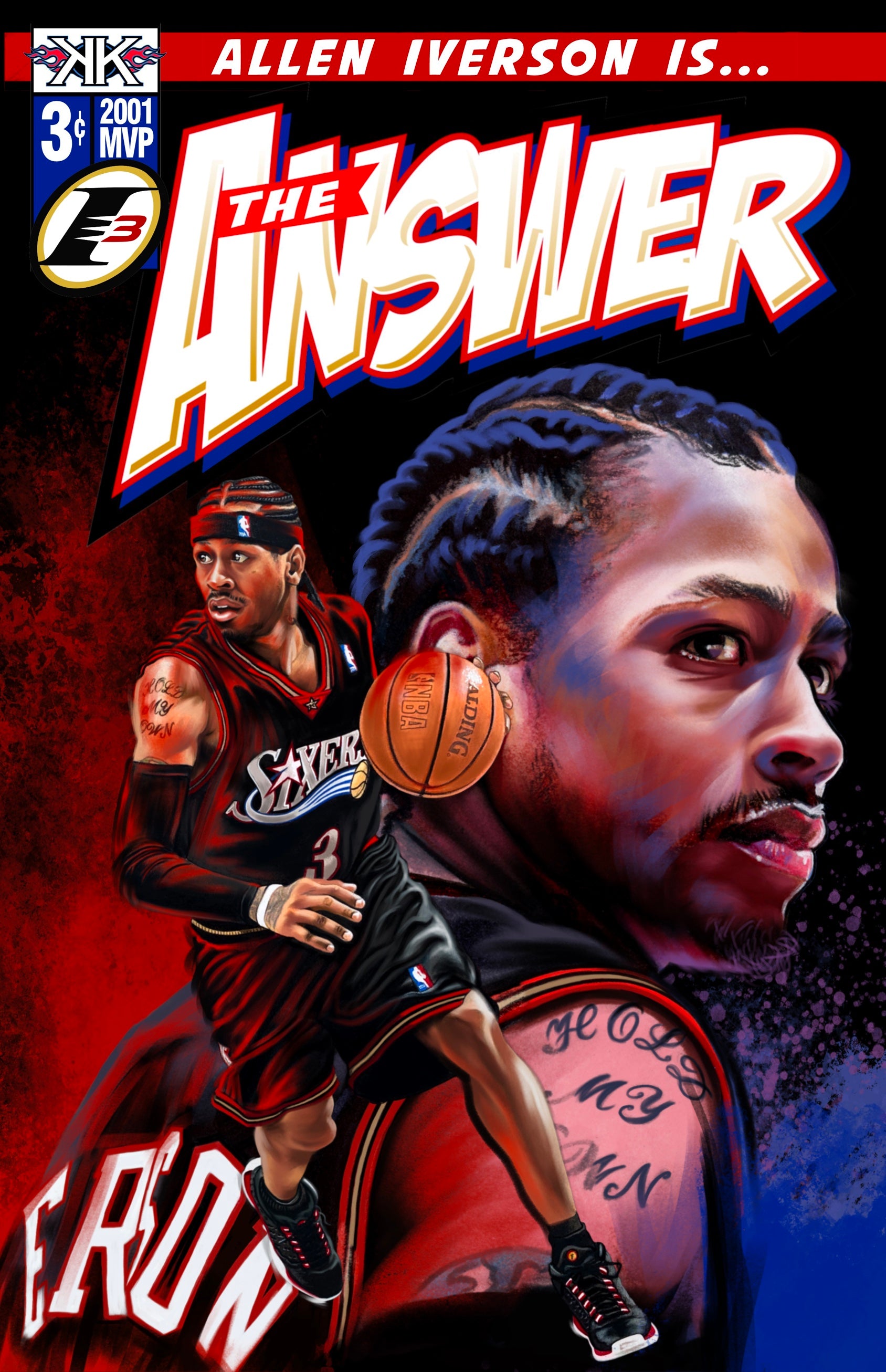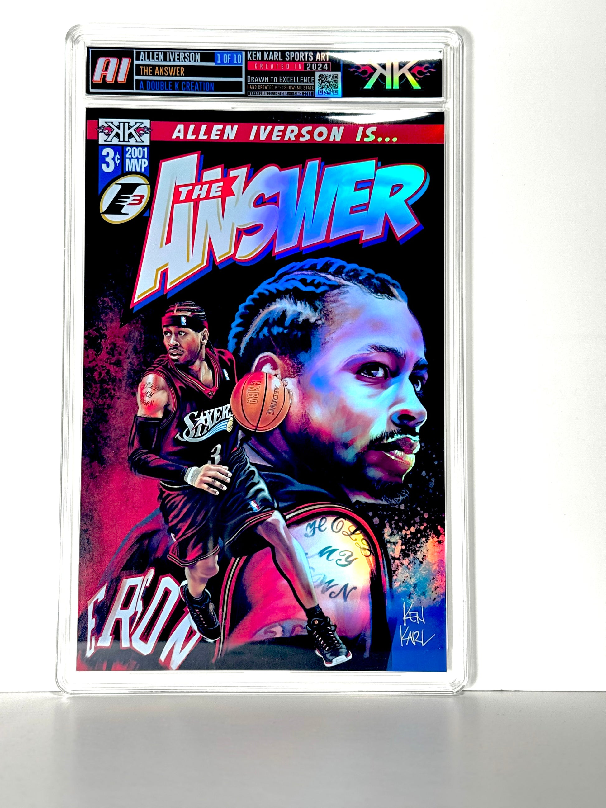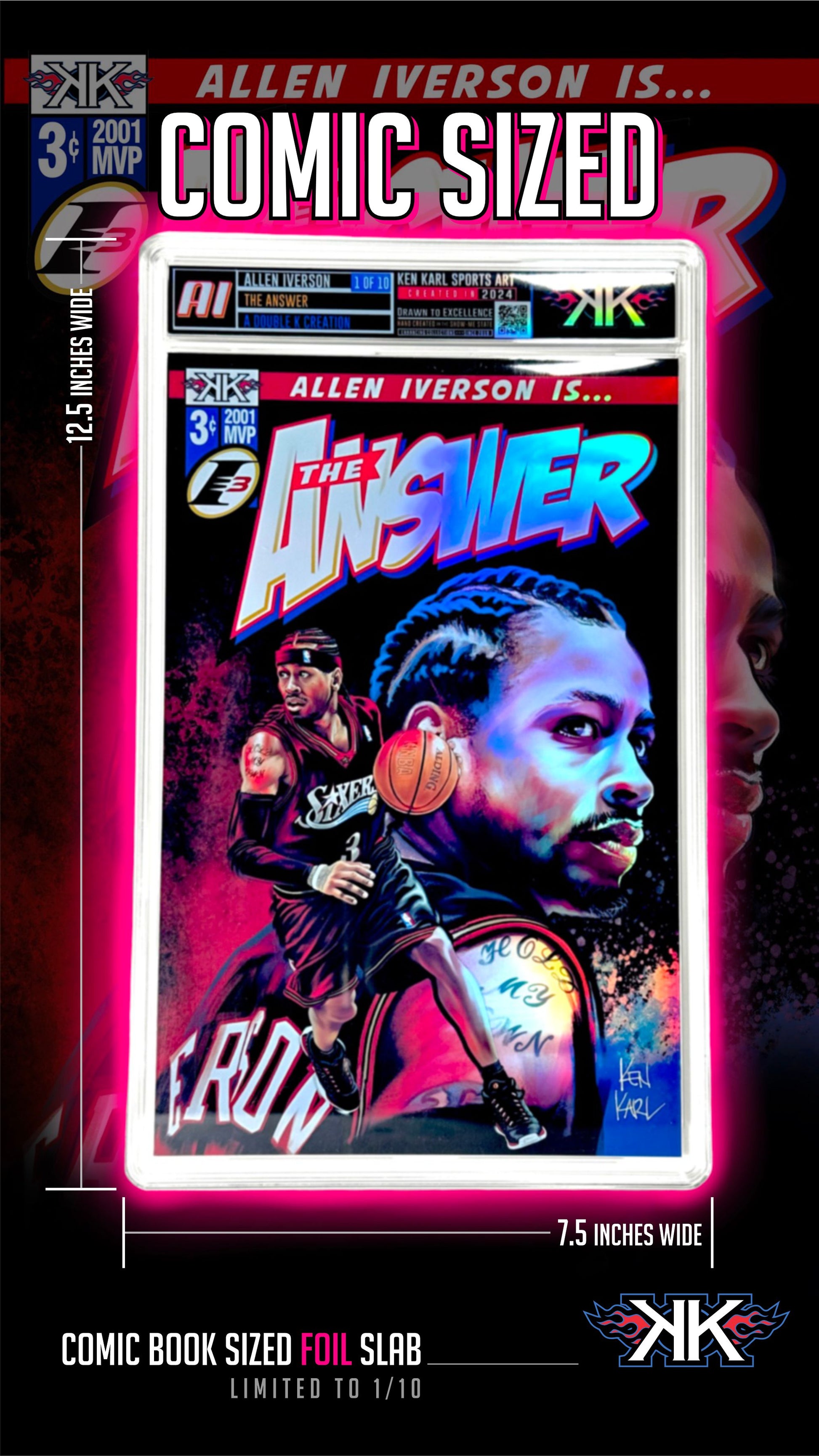 Allen Iverson is THE ANSWER!! These are limited to just (25) Allen Iverson Comic Cover Slabs. EACH comic sized slab is a holographic foil, signed by the artist himself. Ken has painted each image digitally using the art program Procreate. Each image is a reproduction on holographic film of an ORIGINAL work of art...These are NOT Photo-shopped images.