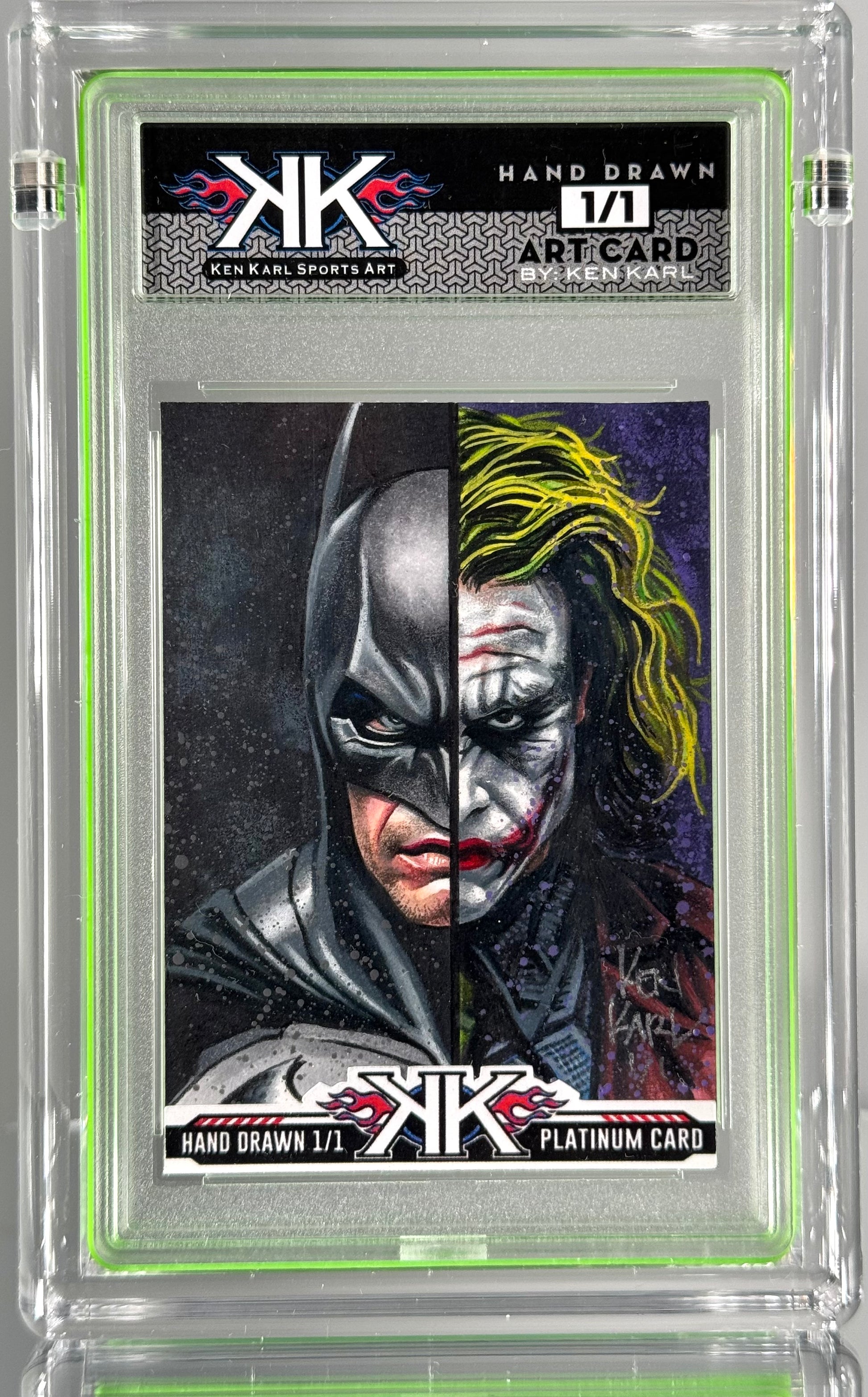 Batman and Joker! This is a HAND DRAWN 1/1 art card drawn DIRECTLY ON CARD. This is original artwork, created with markers, colored pencil and acrylic paint. Drawn directly on illustration board. It is NOT an AI image, NOT a PHOTOSHOP image... it is original hand created artwork, a mini-masterpiece and TRUE ONE of a KIND!
