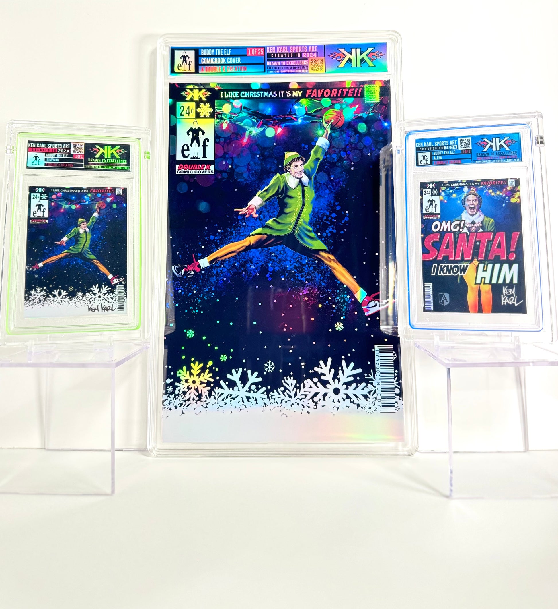 Buddy the Elf is here to spread Christmas CHEER!! These are limited to just (25) Buddy the Elf JUMPELF Comic Cover Slabs. EACH comic sized slab is a holographic foil, signed by the artist himself. Ken has painted each image digitally using the art program Procreate. Each image is a reproduction on holographic film of an ORIGINAL work of art...These are not Photo-shopped images.