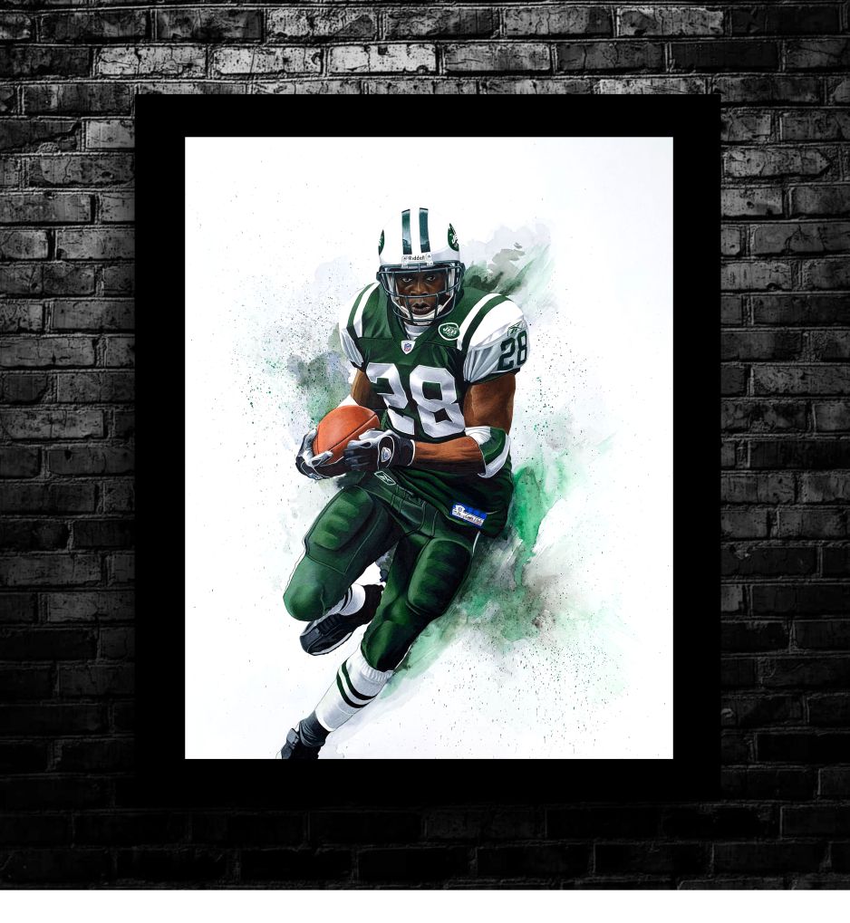 A Limited Edition print of an ORIGINAL mixed media drawing; created using paint, marker and colored pencil. It depicts New York Jet and NFL Hall of Famer, Curtis Martin. Each print is individually numbered and signed by Ken. Print run is limited to 100.