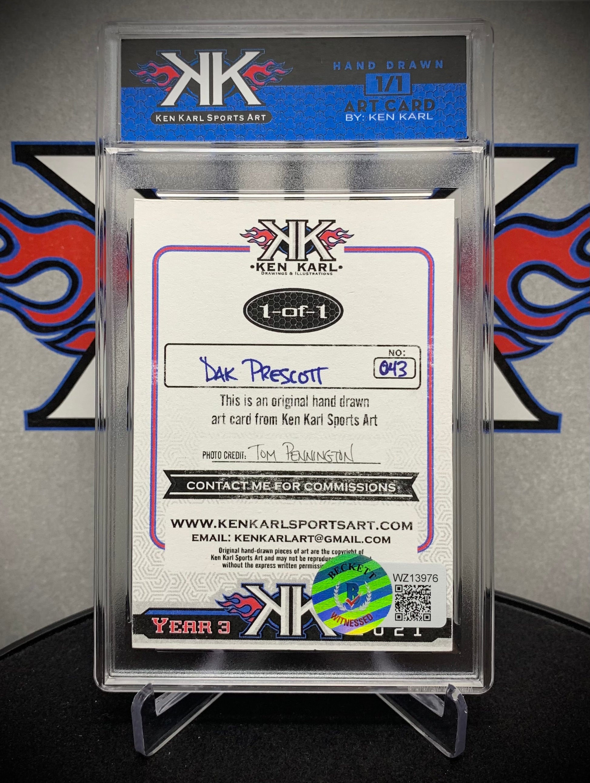A 1/1 ORIGINAL work of art drawn on trading card sized illustration board of Dallas Cowboy QB, Dak Prescott. This card has an on card AUTOGRAPH from Dak Prescott in blue ink. The auto has been authenticated with sticker on the back, by Beckett Authentication.