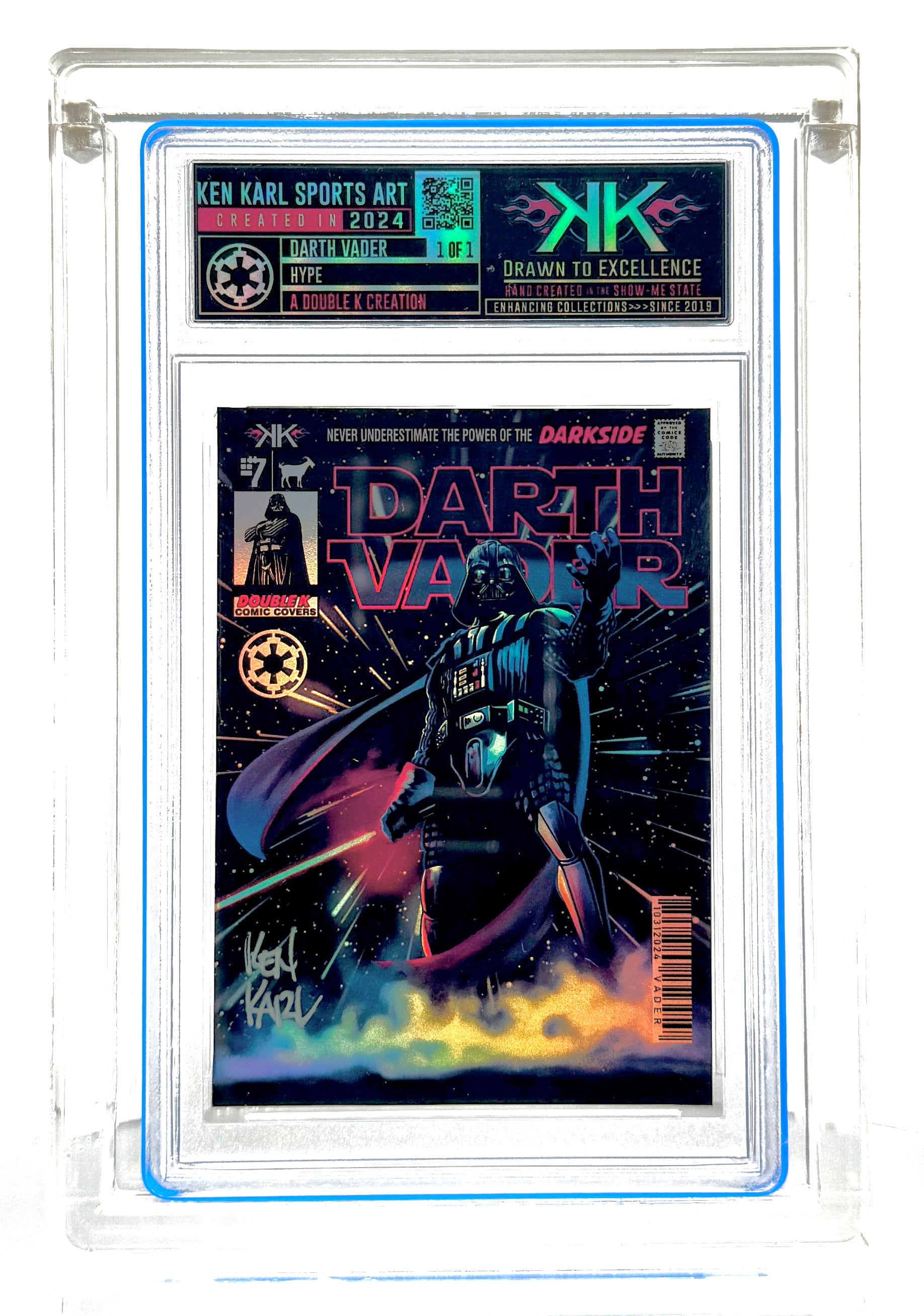 EACH CARD IS ORIGINAL hand crafted artwork!! I have drawn/painted Darth Vader at a larger size and then reproduced it at a smaller size on various versions of holographic film or canvas, creating a one of a kind art card collectible! Each card is a mini work of art. Meant to be FUN and unique additions to your collection. (Please NOTE, since each card is a hand crafted unique work of art, slight imperfections may exist. These only add to the uniqueness of the collectible.)