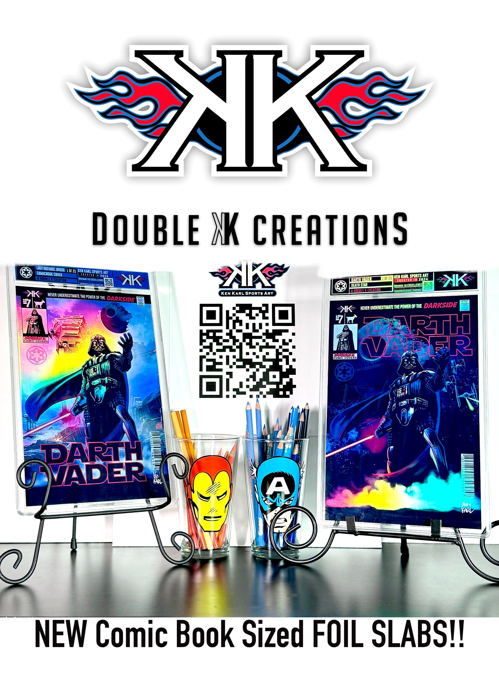 Darth Vader is HERE!! These are limited to just (25) Darth Vader Death Star Comic Cover Slabs. EACH comic sized slab is a holographic foil, signed by the artist himself. Ken has painted each image digitally using the art program Procreate. Each image is a reproduction on holographic film of an ORIGINAL work of art...These are not Photo-shopped images.