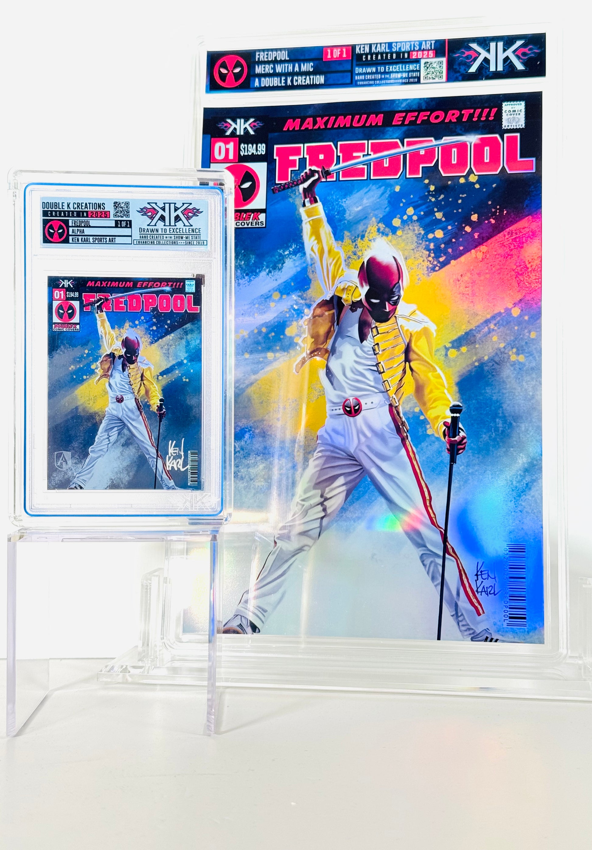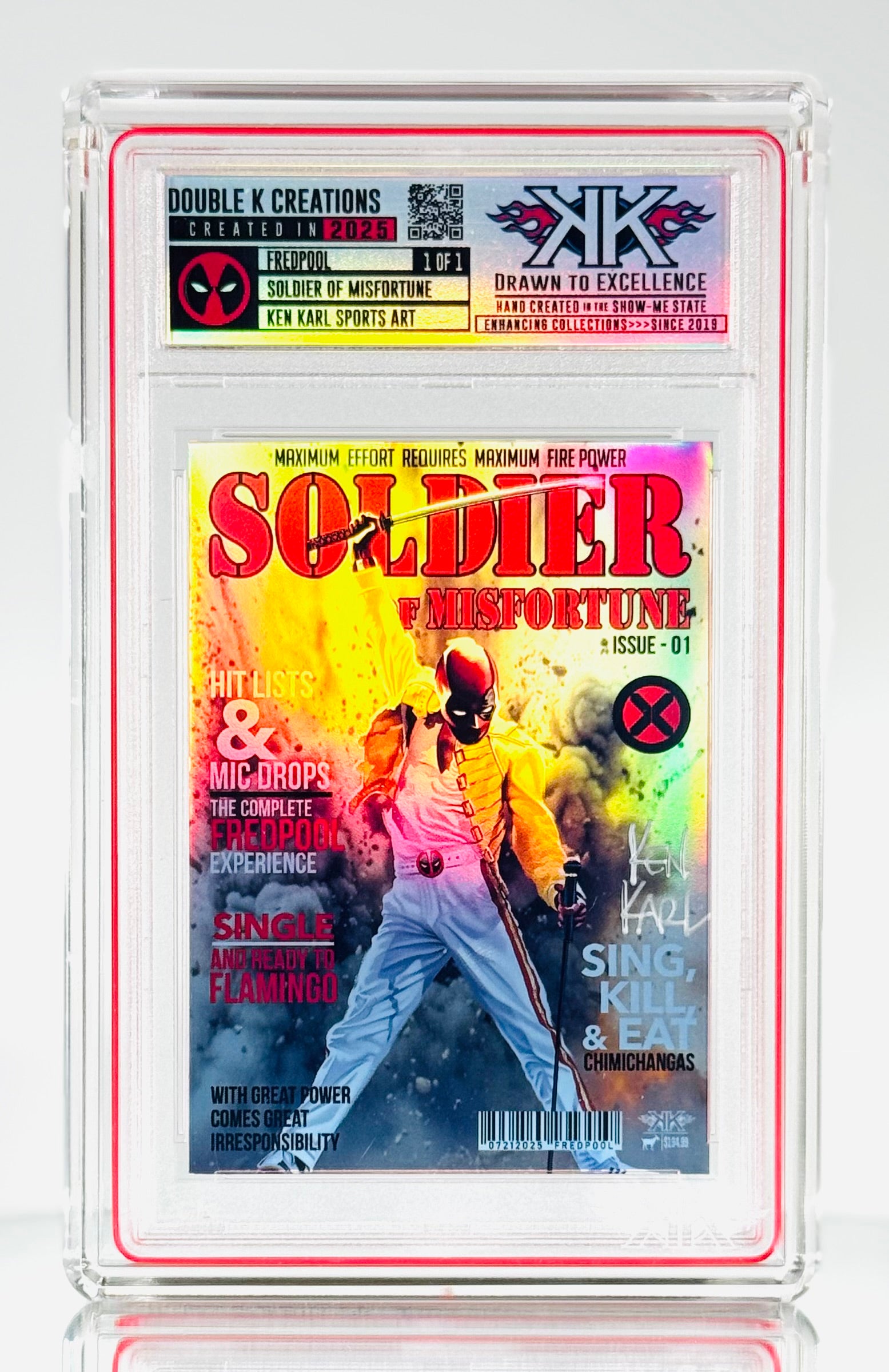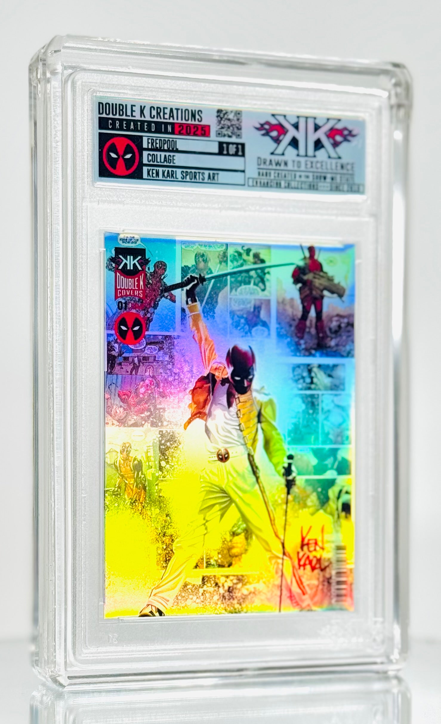 EACH CARD IS ORIGINAL hand crafted artwork!! I have drawn/painted each FREDPOOL image capturing the Merc with a Mic. They are then produced at smaller sizes on various versions of holographic card sized film, creating a one of a kind art card collectible! Each card is created from an ORIGINAL artwork created by Ken and hand constructed as well. THESE ARE NOT AI! These is NOT PHOTOSHOPPED IMAGES!! Each image has been painted on a digital tablet. Each piece is ORIGINAL HAND PAINTED and hand crafted.This makes EACH card a mini work of art. These cards are meant to be FUN and unique additions to your collection. They are not for resale. (Please NOTE, since each card is a hand crafted unique work of art, slight imperfections may exist. These only add to the uniqueness of the collectible.)