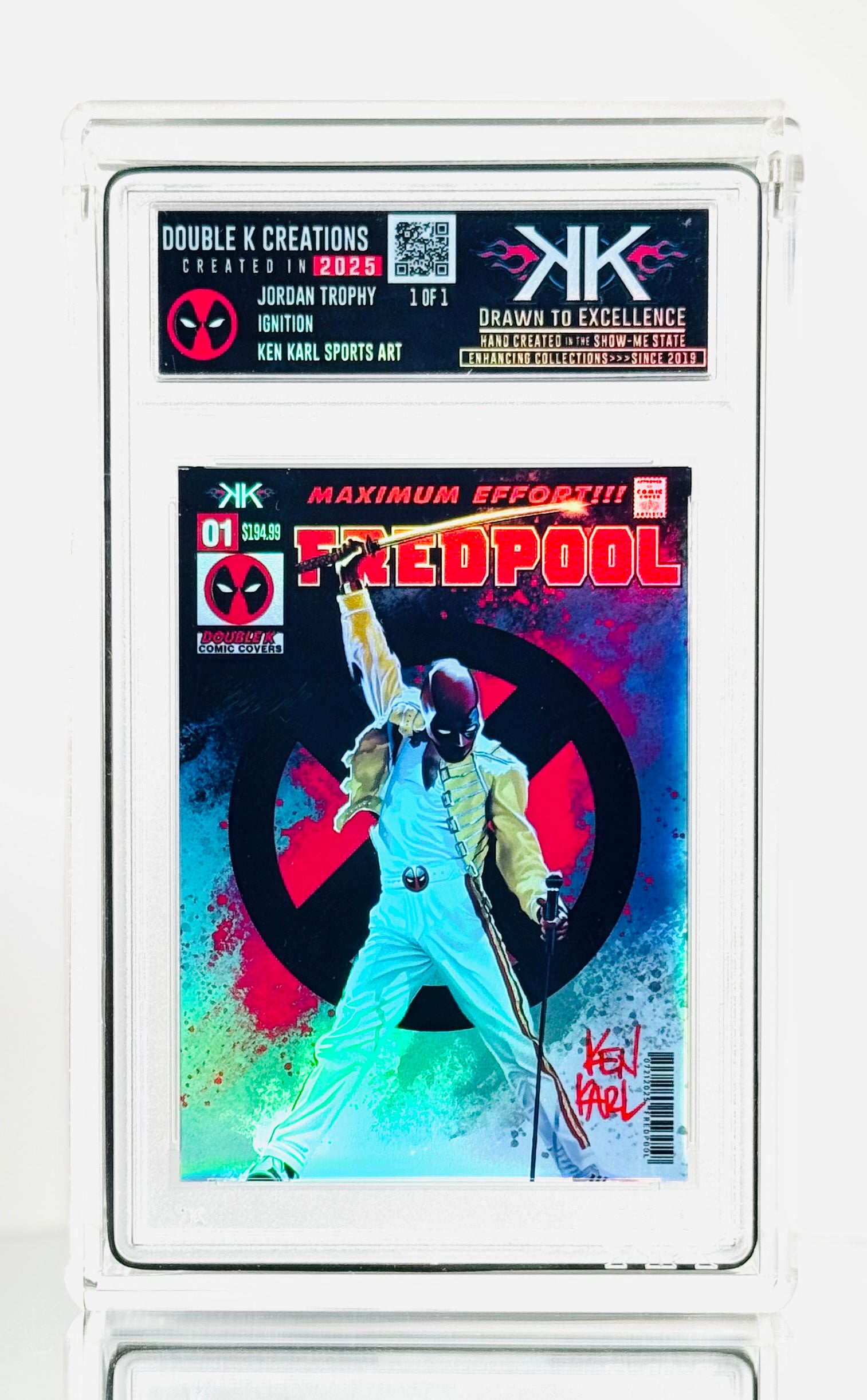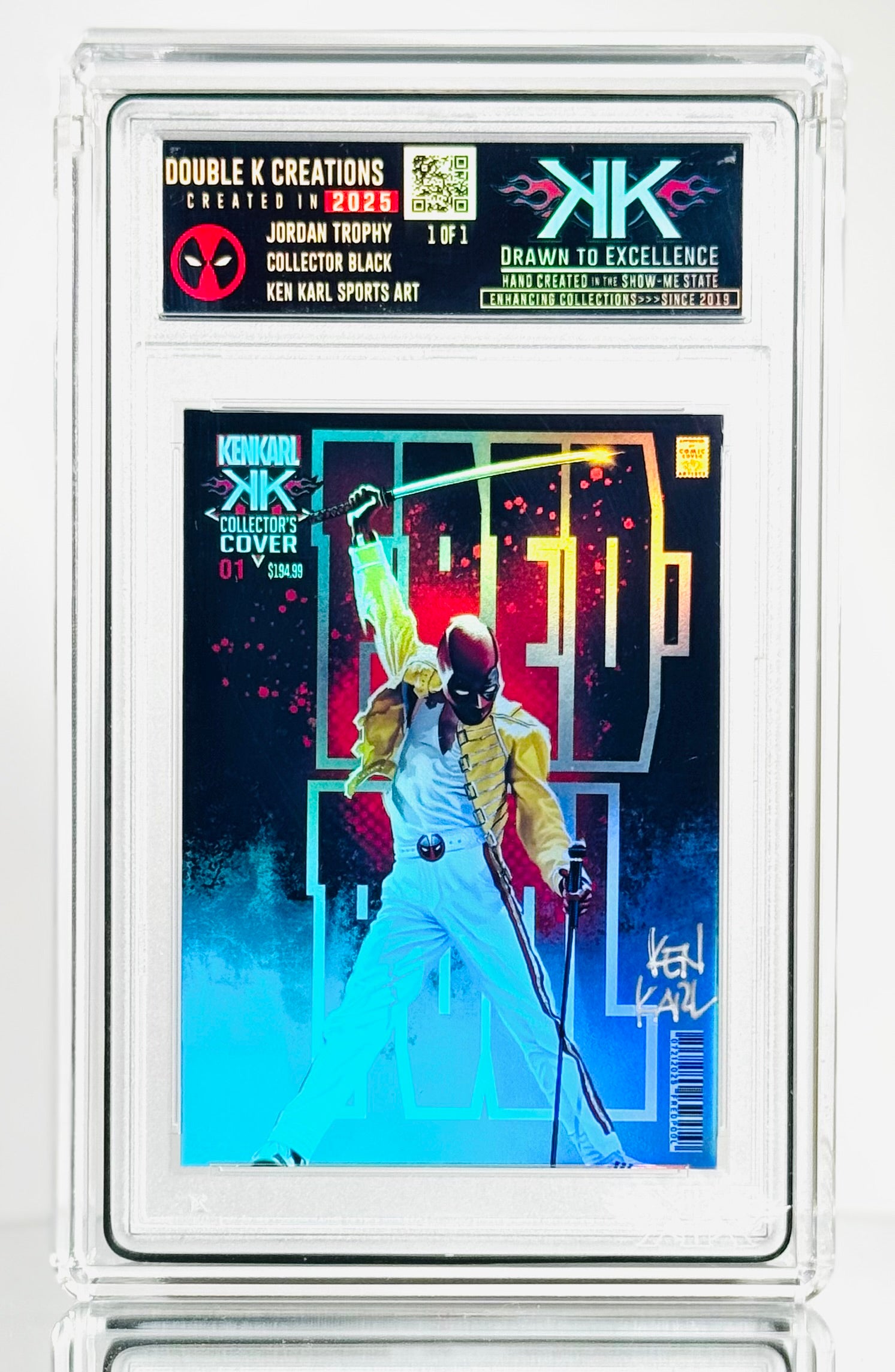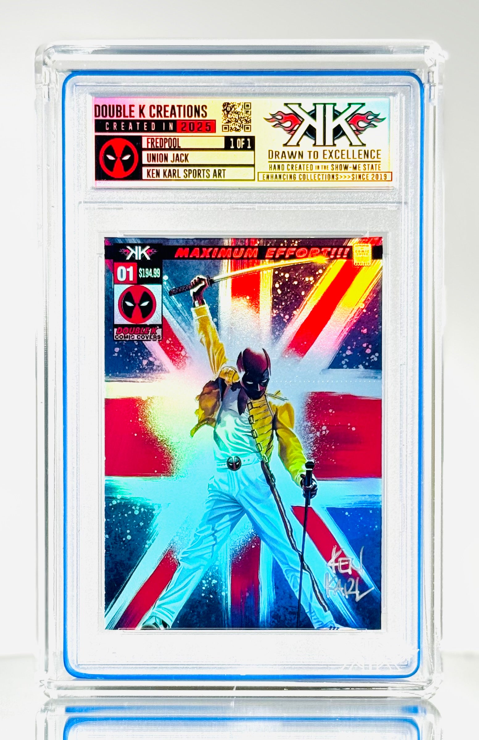 EACH CARD IS ORIGINAL hand crafted artwork!! I have drawn/painted each FREDPOOL image capturing the Merc with a Mic. They are then produced at smaller sizes on various versions of holographic card sized film, creating a one of a kind art card collectible! Each card is created from an ORIGINAL artwork created by Ken and hand constructed as well. THESE ARE NOT AI! These is NOT PHOTOSHOPPED IMAGES!! Each image has been painted on a digital tablet. Each piece is ORIGINAL HAND PAINTED and hand crafted.This makes EACH card a mini work of art. These cards are meant to be FUN and unique additions to your collection. They are not for resale. (Please NOTE, since each card is a hand crafted unique work of art, slight imperfections may exist. These only add to the uniqueness of the collectible.)