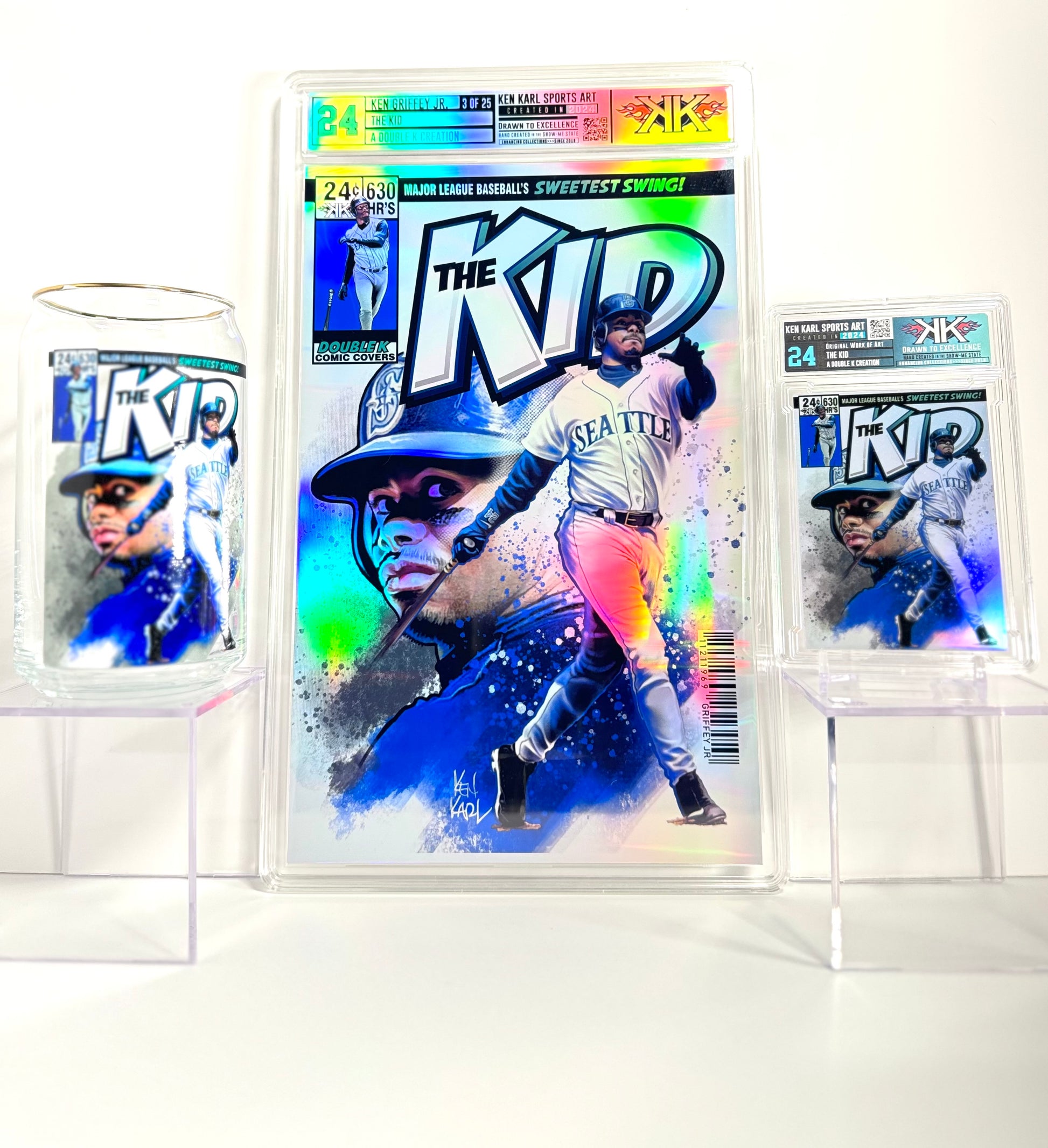 Ken Griffey Jr and the SWEETEST swing in history!! These are limited to just (25) Ken Griffey Jr. Comic Cover Slabs. EACH comic sized slab is a holographic foil, signed by the artist himself. Ken has painted each image digitally using the art program Procreate. Each image is a reproduction on holographic film of an ORIGINAL work of art...These are not Photo-shopped images.
