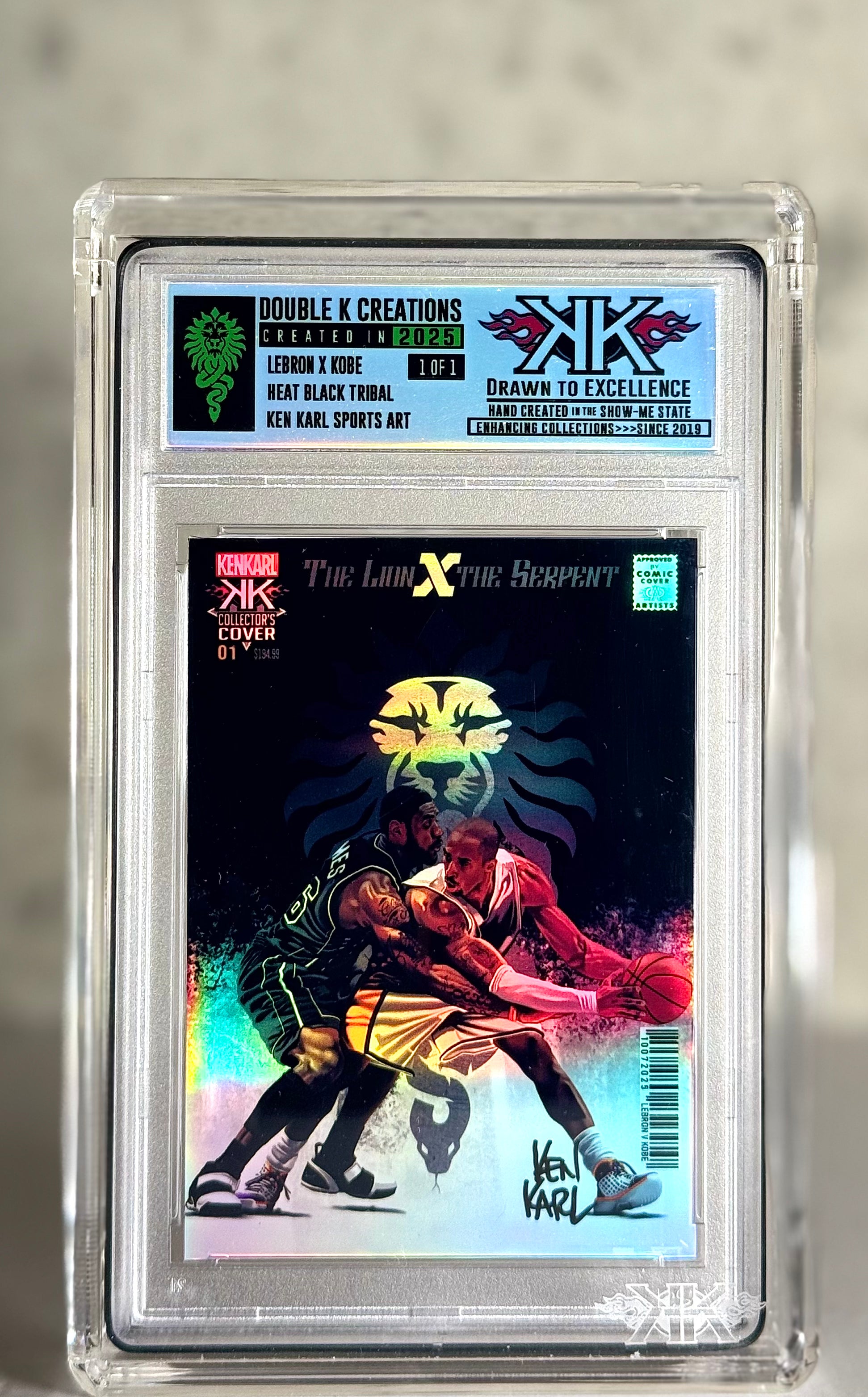 EACH CARD IS ORIGINAL hand crafted artwork!! I have drawn/painted each LEBRON X KOBE image capturing both NBA ICONS. They are then produced at smaller sizes on various versions of holographic card sized film, creating a one of a kind art card collectible! Each card is created from an ORIGINAL artwork created by Ken and hand constructed as well. THESE ARE NOT AI! These is NOT PHOTOSHOPPED IMAGES!! Each image has been painted on a digital tablet. Each piece is ORIGINAL HAND PAINTED and hand crafted.This makes EACH card a mini work of art. These cards are meant to be FUN and unique additions to your collection. They are not for resale. (Please NOTE, since each card is a hand crafted unique work of art, slight imperfections may exist. These only add to the uniqueness of the collectible.)