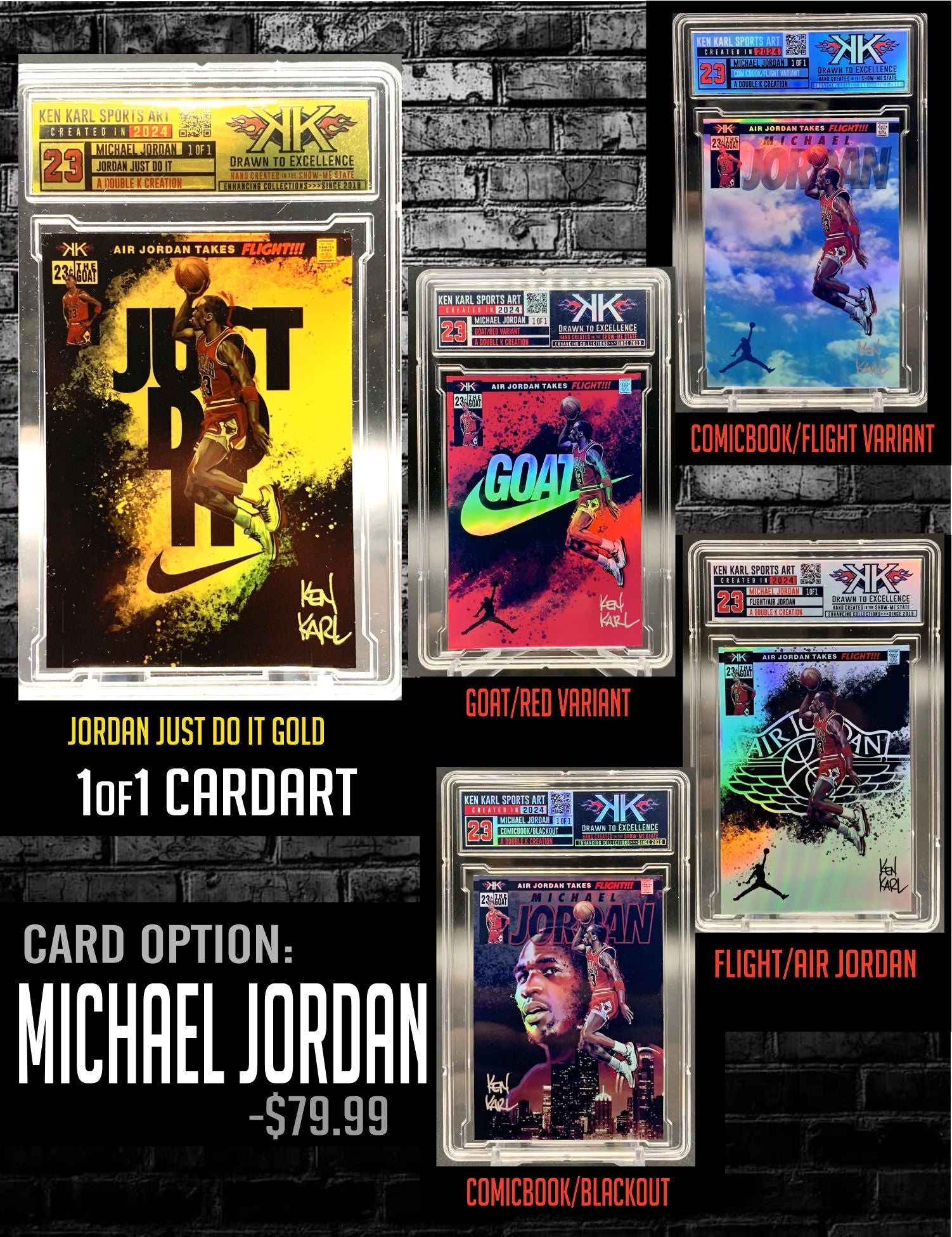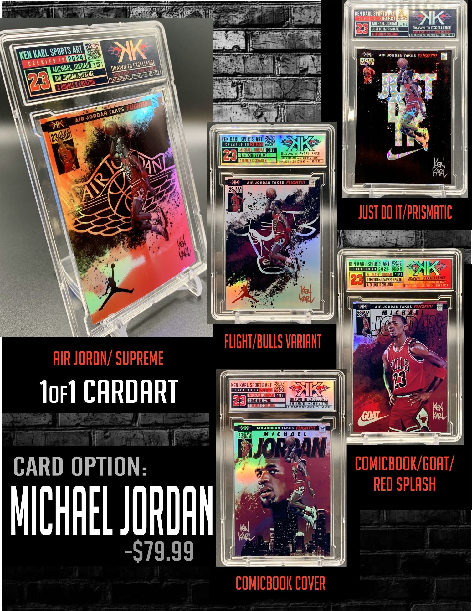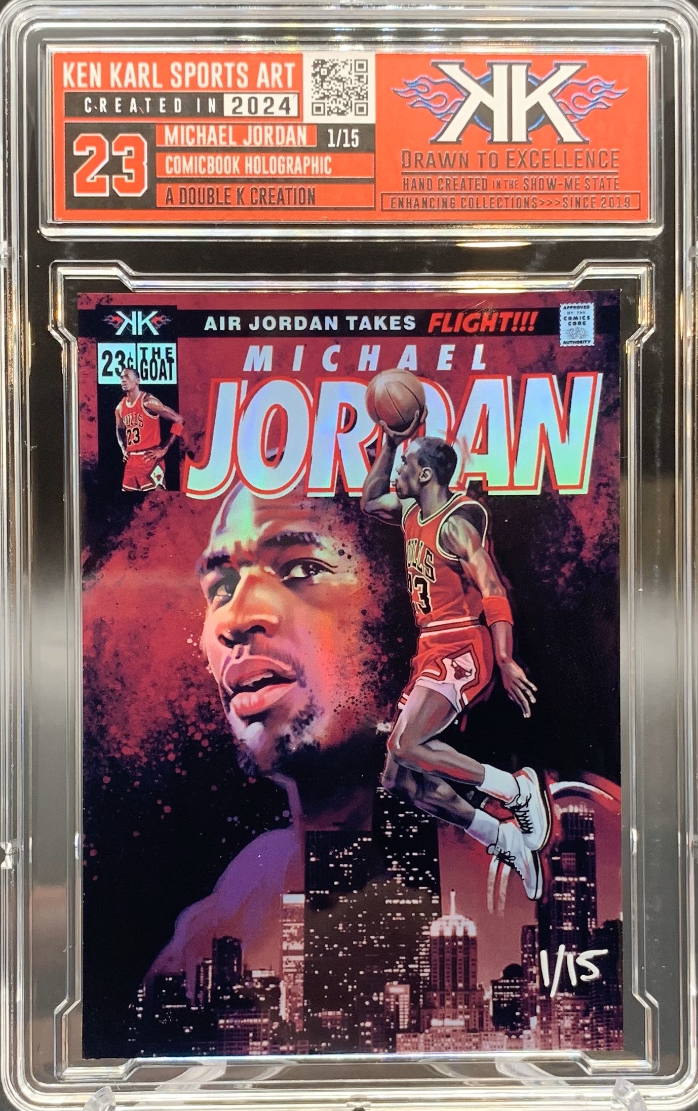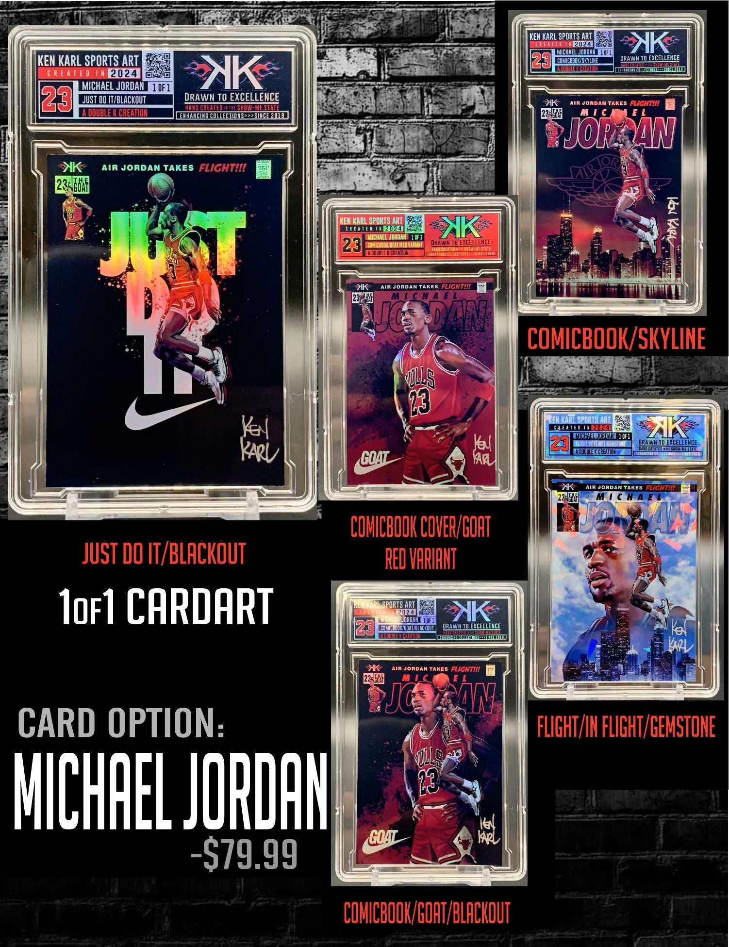 There are (25) 1/1 MICHAEL JORDAN art cards total. Each is listed INDIVIDUALLY BELOW. Each comic book cover inspired card or its variant, is ORIGINAL artwork hand crafted and produced on trading card sized cardstock. Making each card a hand crafted and rare collectible. These are mini works of art! Meant to be FUN and unique additions to a collection. All of these are produced with a different holographic effect. They are FUN must see mini works of art!