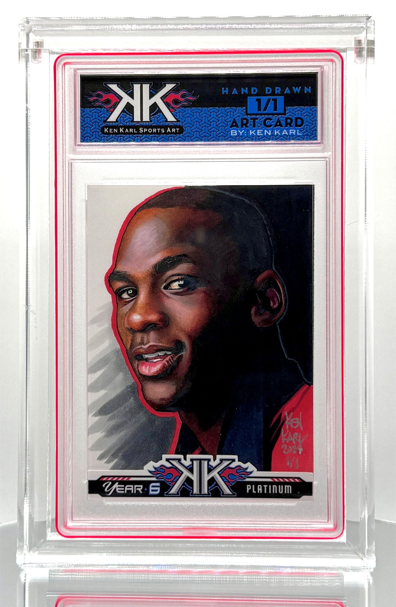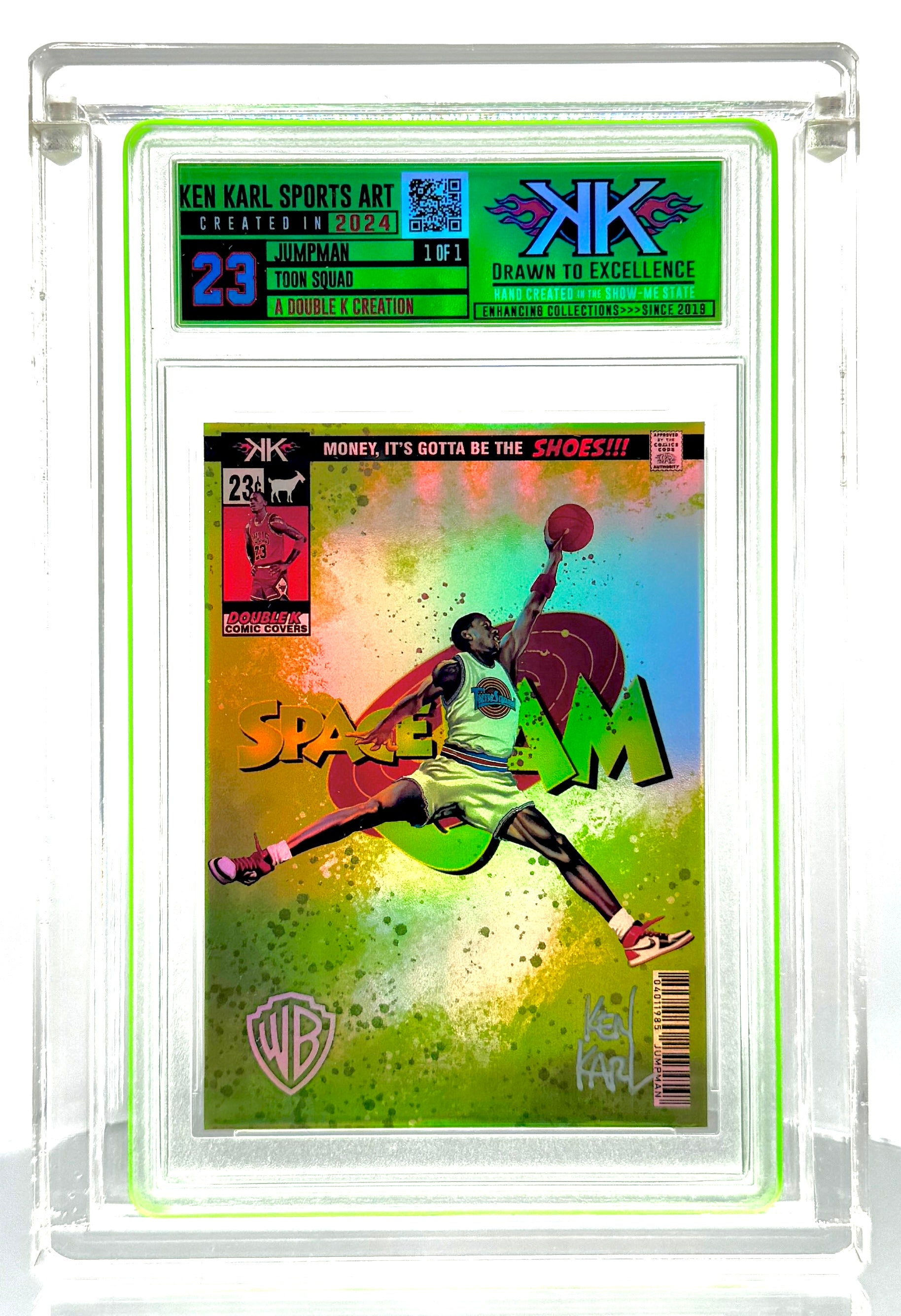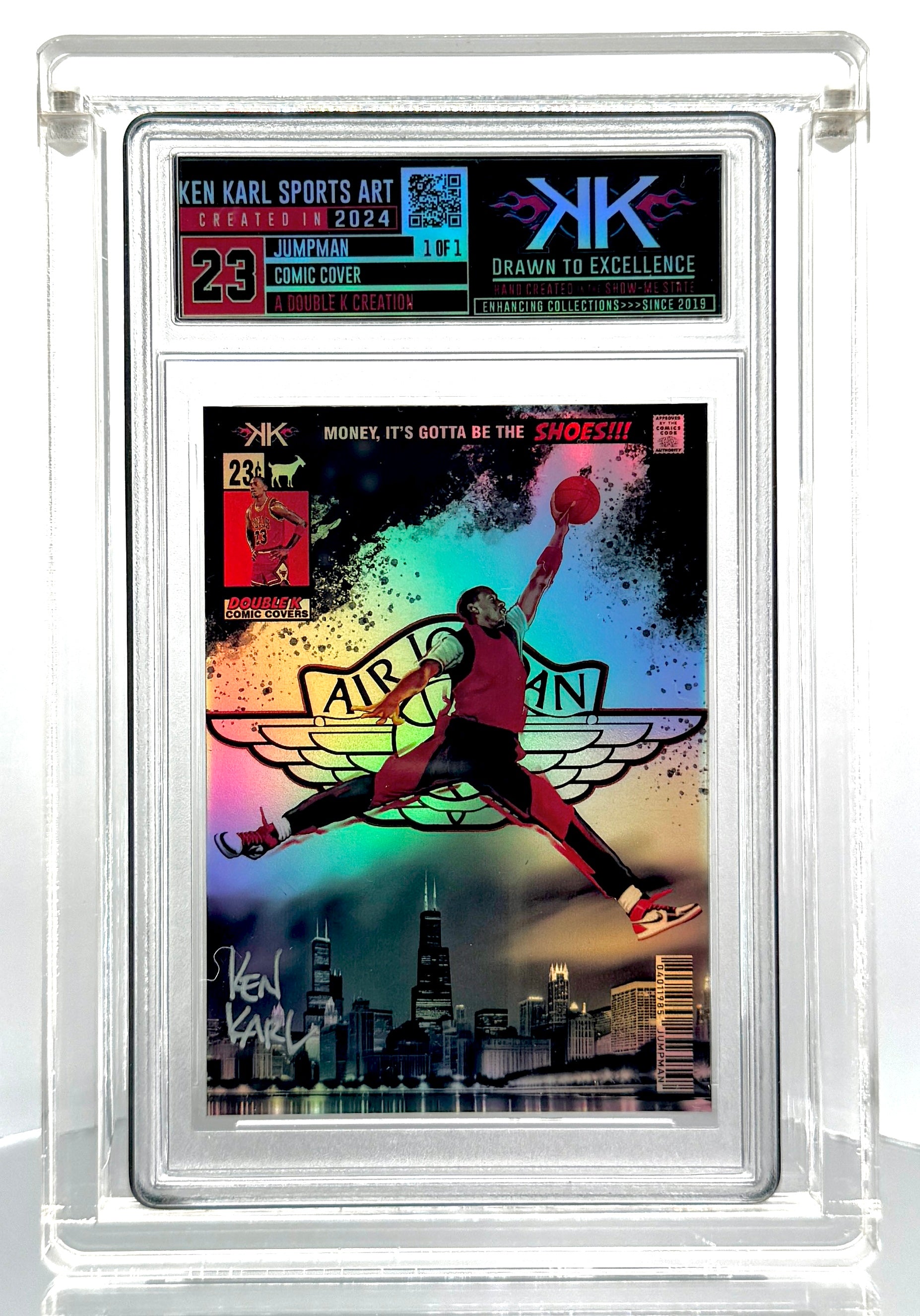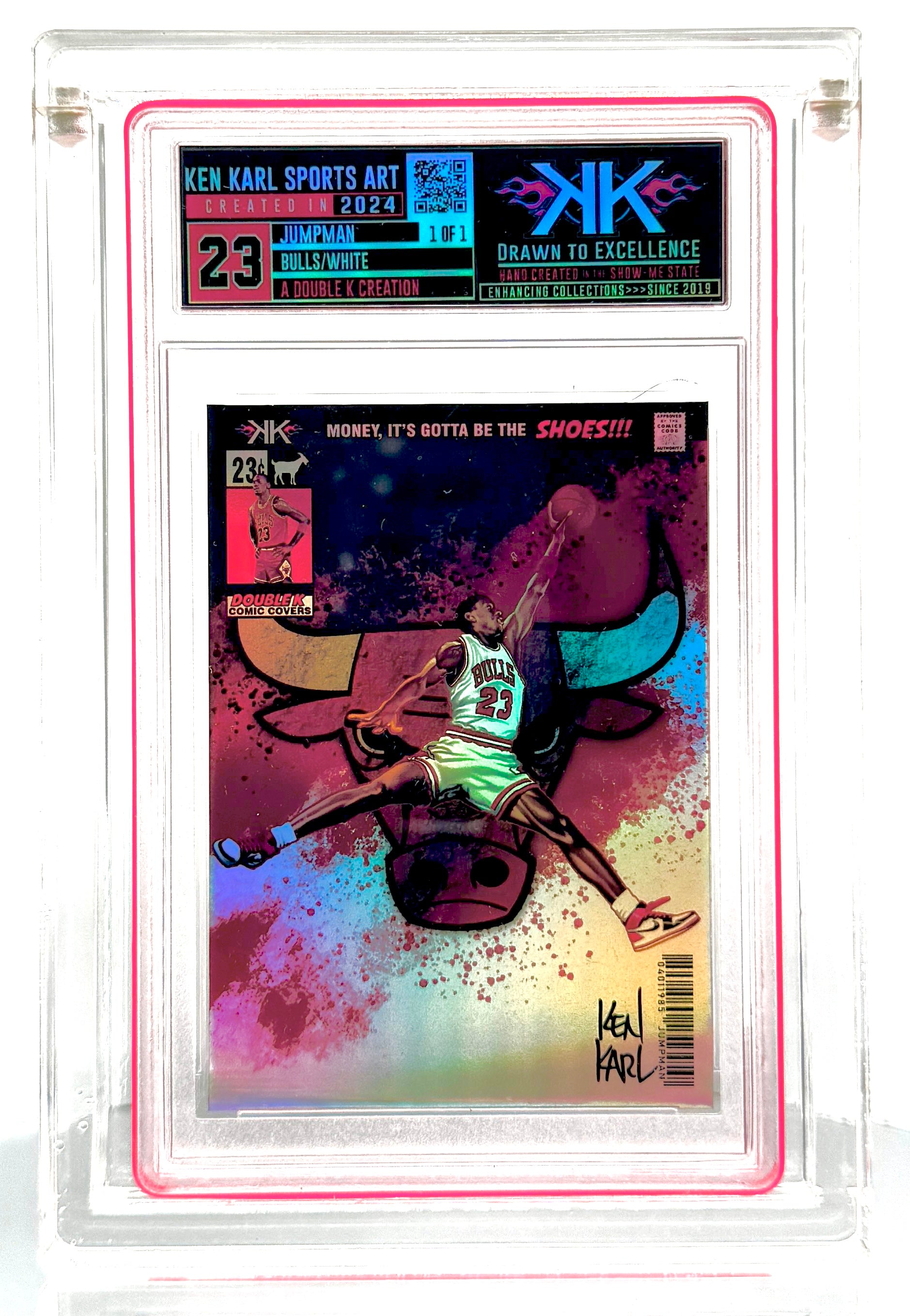A NEW look at the ICONIC Jordan JUMPMAN!! These are limited to just (25) JUMPMAN 1/1 art cards. NEVER have we seen MJ in each of these uniforms in his iconic JUMPMAN pose! EACH art card is a UNIQUE piece of ORIGINAL ART. Ken has painted each image creating multiple versions of this artwork, unique 1/1 versions produce on trading card sized holographic film. ALL art cards are either (1) of the images posted or a variant thereof, including a single GOLD card. In hopes of adding even more anticipation to the drop, you will receive (1) RANDOM card from this JUMPMAN set with each purchase. I will also be including the NEW CASE BRICKS in the photos with your purchase as well!! I am ALWAYS trying to make a better collectible for my collectors. I have also produced a special COMPANION 1/1 CARD for this drop. An ON CARD original drawing of Jordan around the time the infamous JUMPMAN logo was created!!