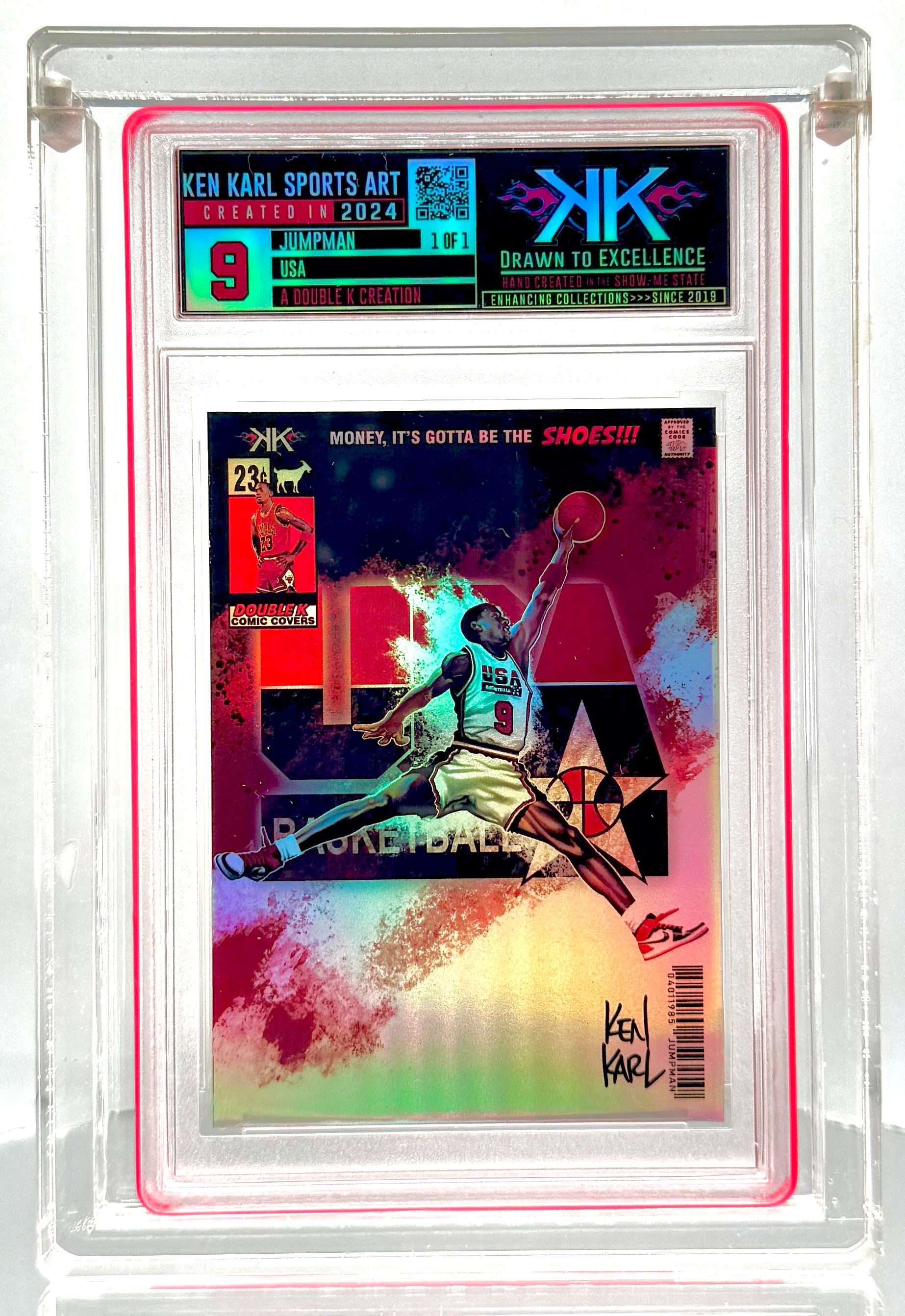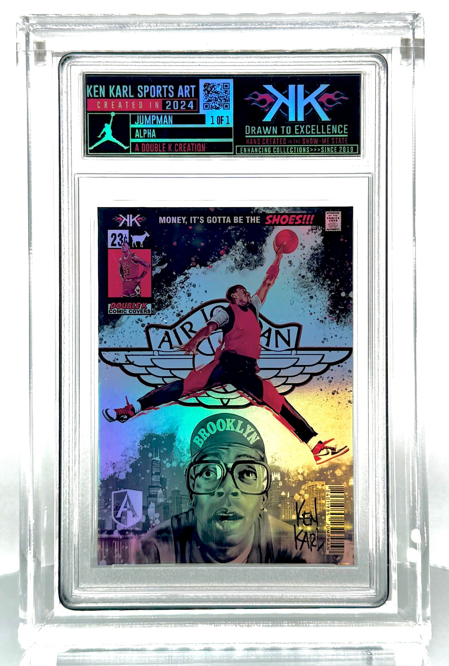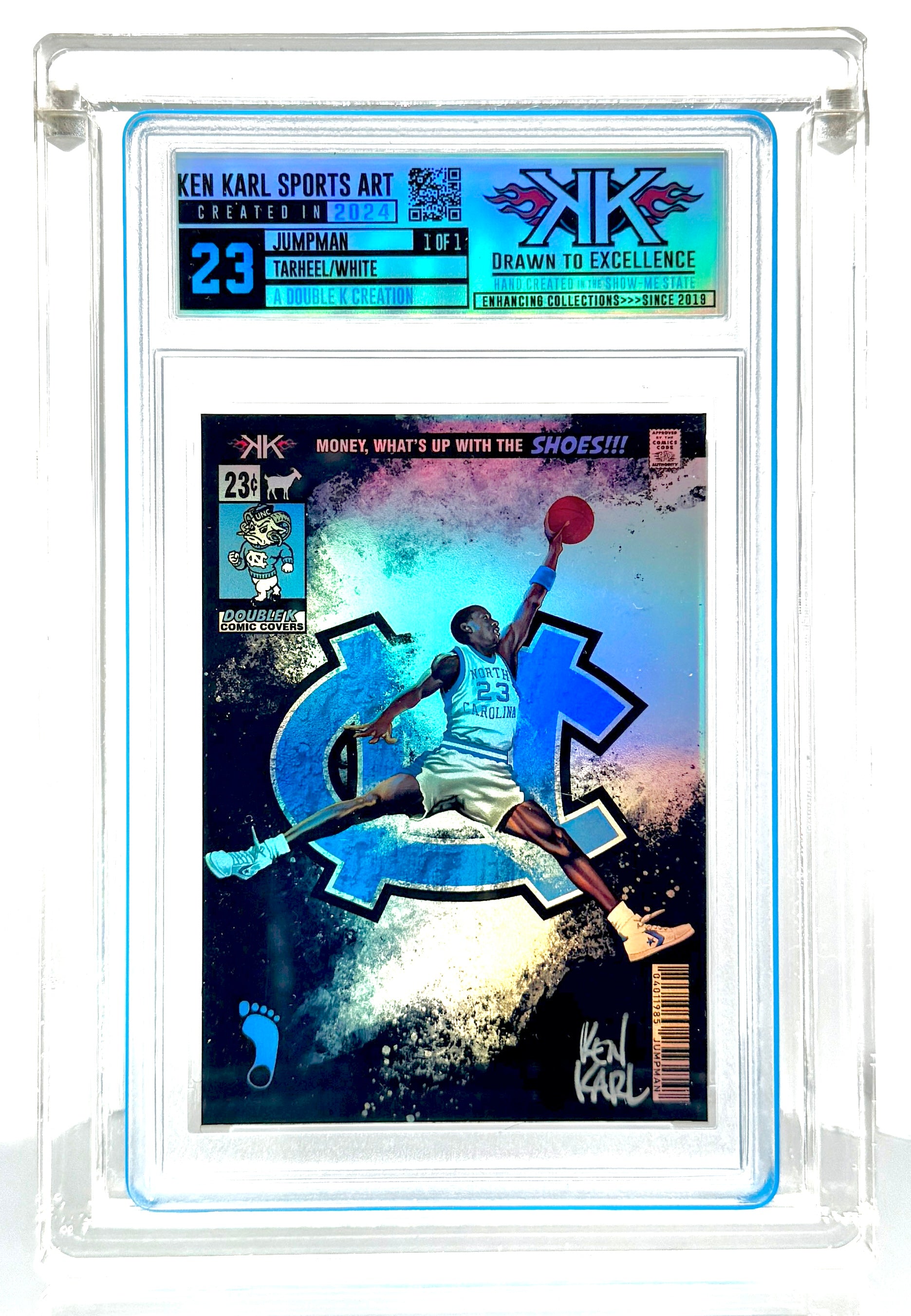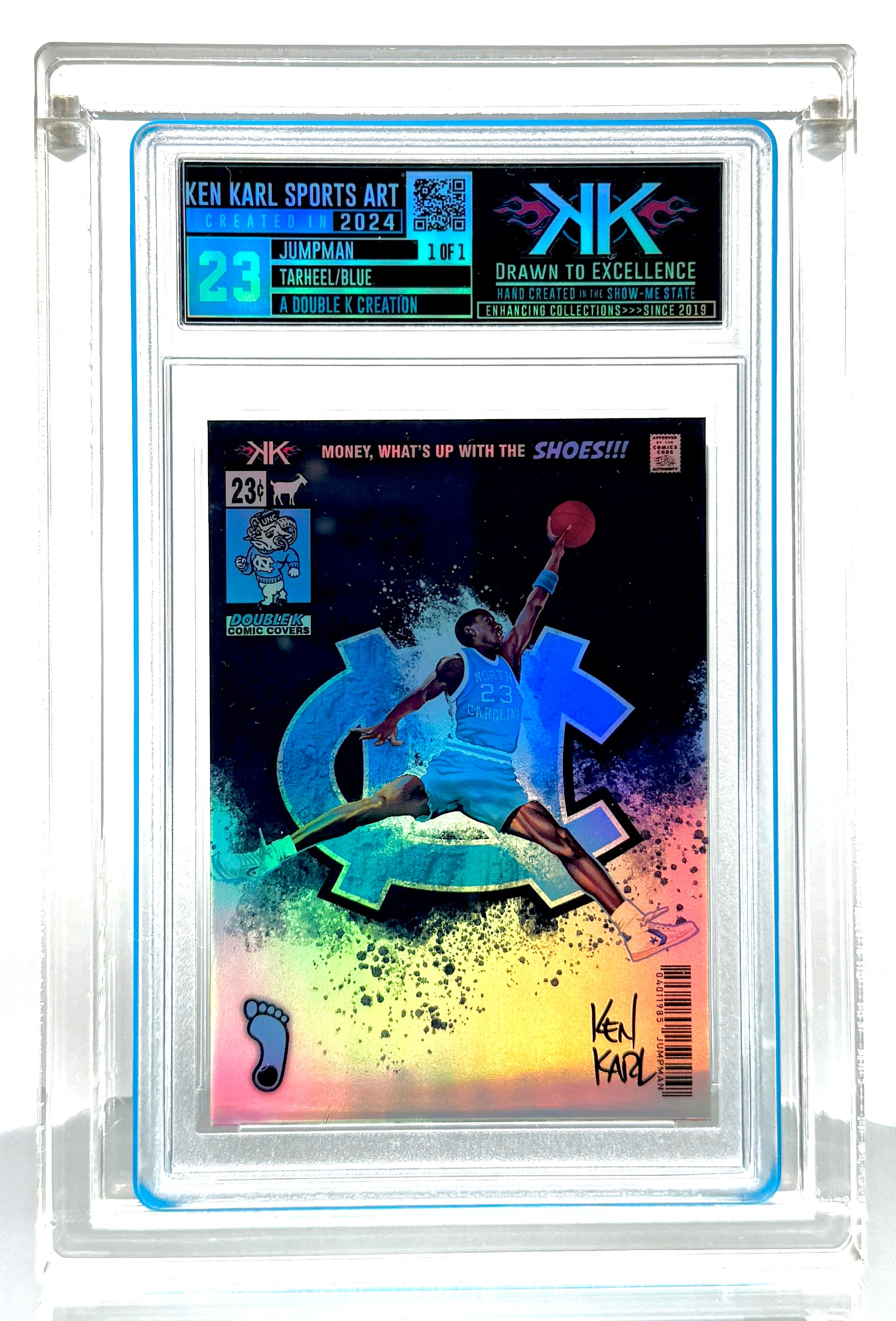 A NEW look at the ICONIC Jordan JUMPMAN!! These are limited to just (25) JUMPMAN 1/1 art cards. NEVER have we seen MJ in each of these uniforms in his iconic JUMPMAN pose! EACH art card is a UNIQUE piece of ORIGINAL ART. Ken has painted each image creating multiple versions of this artwork, unique 1/1 versions produce on trading card sized holographic film. ALL art cards are either (1) of the images posted or a variant thereof, including a single GOLD card. In hopes of adding even more anticipation to the drop, you will receive (1) RANDOM card from this JUMPMAN set with each purchase. I will also be including the NEW CASE BRICKS in the photos with your purchase as well!! I am ALWAYS trying to make a better collectible for my collectors. I have also produced a special COMPANION 1/1 CARD for this drop. An ON CARD original drawing of Jordan around the time the infamous JUMPMAN logo was created!!