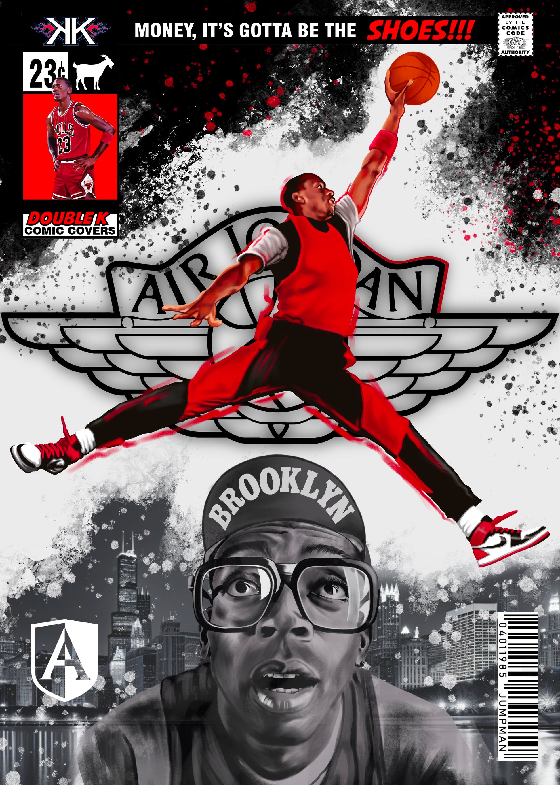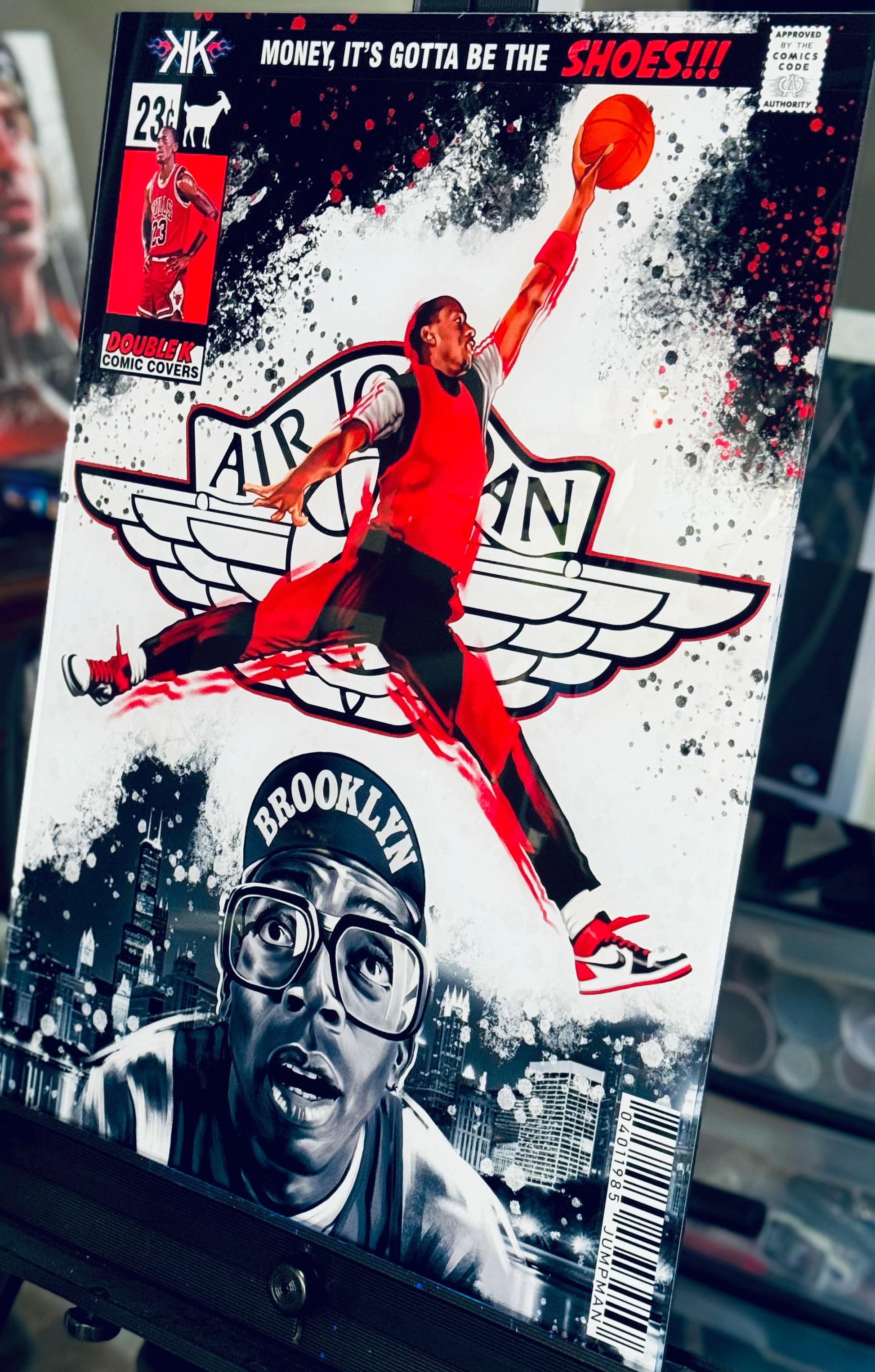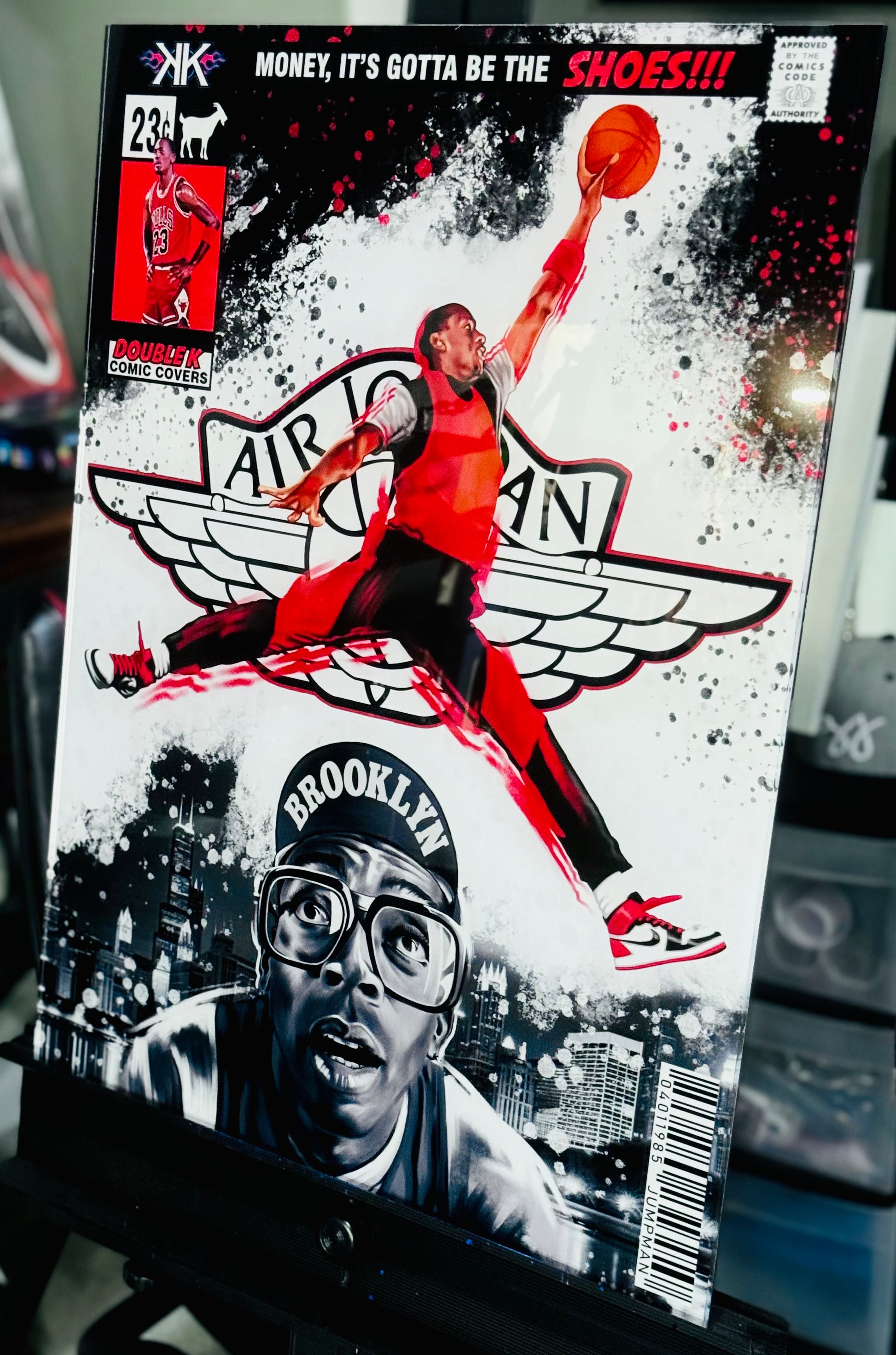 Gotta be the SHOES! Michael Jordan painted in his ICONIC Jumpman poses with Mars Blackman looking on is original artwork hand painted digitally in the art program Procreate. Ken has captured the Jumpman and his ICONIC pose. The image size is 18x24 inches out put on metallic photo paper encased by 1/4 inch of clear acrylic. The back is complete with attached wall mount assembly. Making it simple to hang as the focal piece of your Jumpman art collection.