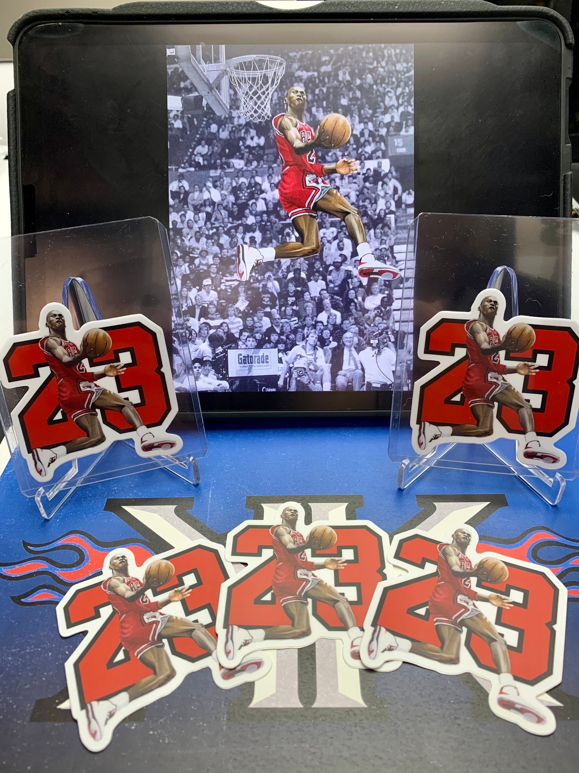 A die cut STICKER of an ORIGINAL mixed media drawing; created using paint, marker and colored pencil. It depicts NBA Legend and Hall of Famer, Michael Jordan.