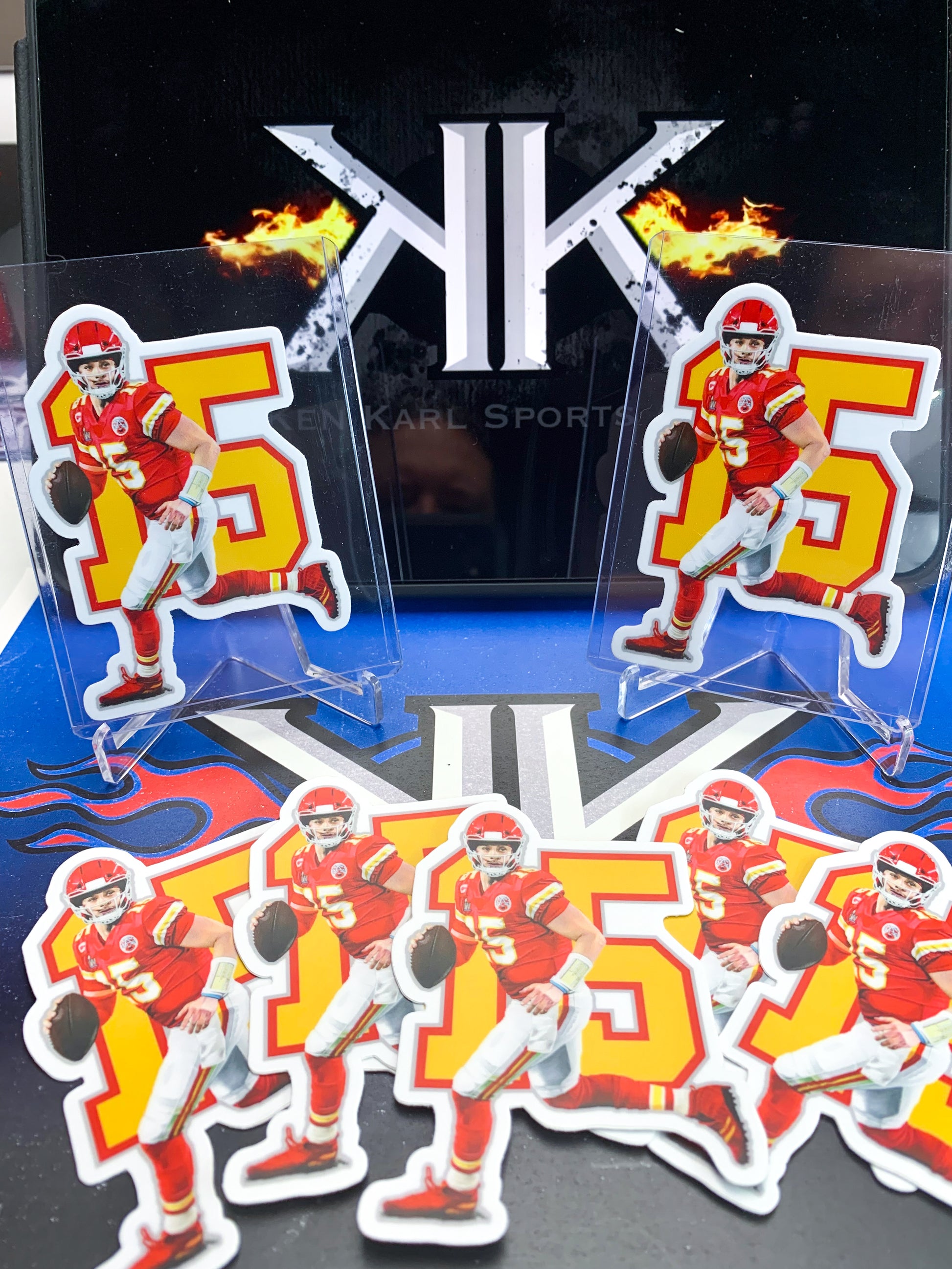 A die cut STICKER of an ORIGINAL mixed media drawing; created using paint, marker and colored pencil. It depicts NFL SUPERSTAR and Kansas City Chief, Patrick Mahomes.