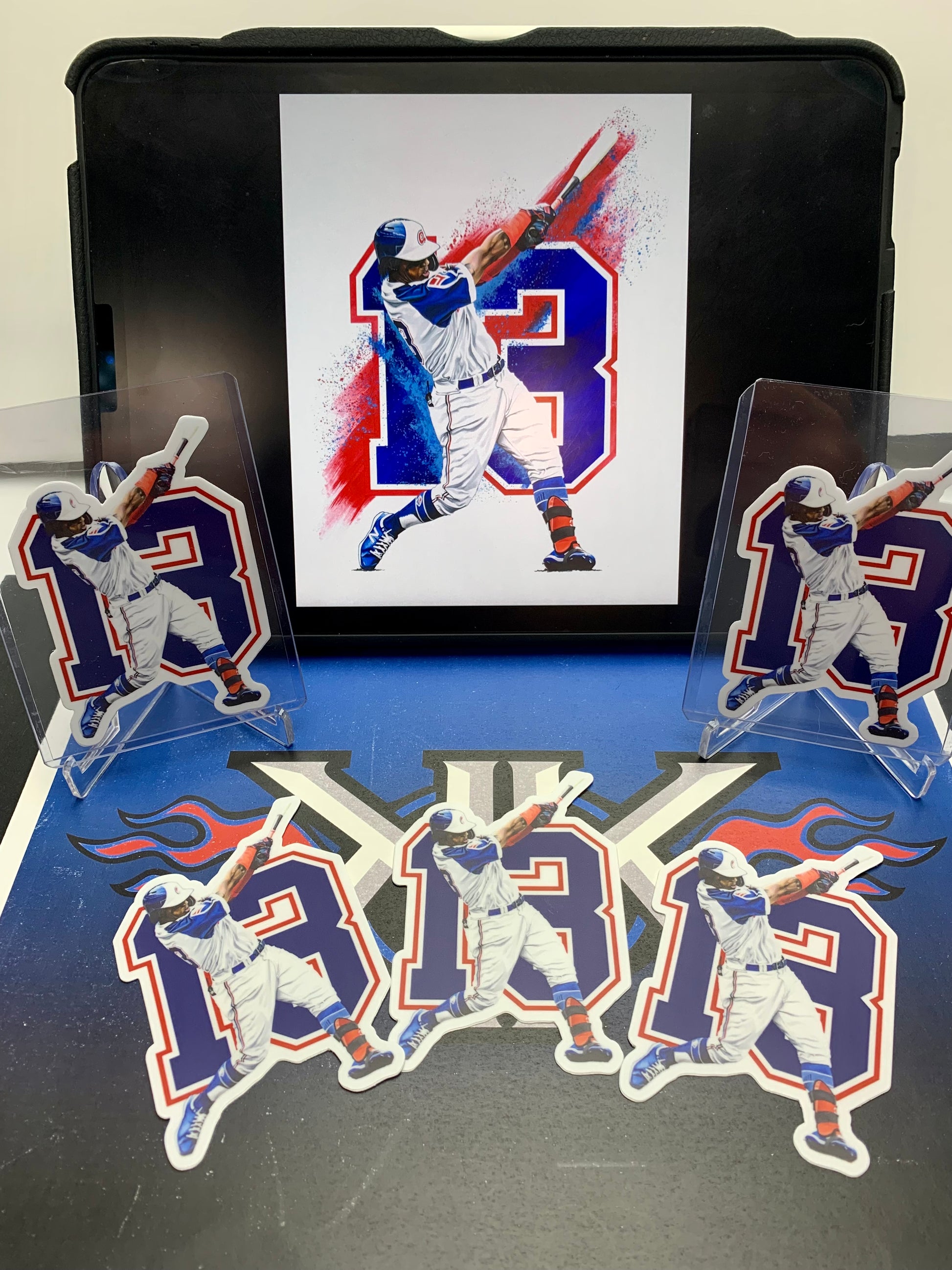 A die cut STICKER of an ORIGINAL mixed media drawing; created using paint, marker and colored pencil. It depicts Atlanta Braves SUPERSTAR, Ronald Acuna Jr.