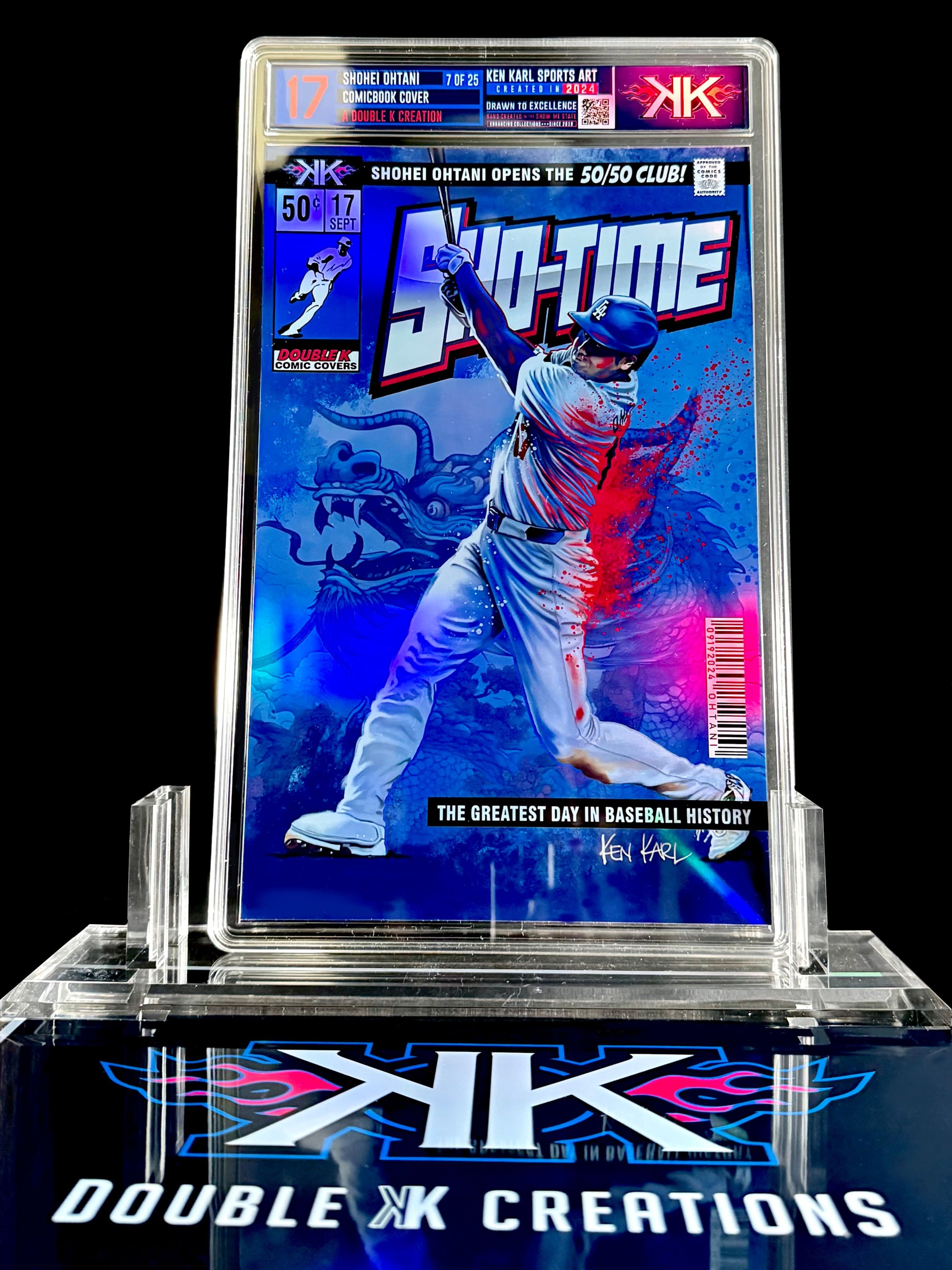 Shohei Ohtani Charters the 50/50 Club!! These are limited to just (25) Shohei Ohtani 50/50 Dragon Comic Cover Slabs. EACH comic sized slab is a holographic foil, signed by the artist himself. Ken has painted each image digitally using the art program Procreate. Each image is a reproduction on holographic film of an ORIGINAL work of art...These are not Photo-shopped images.