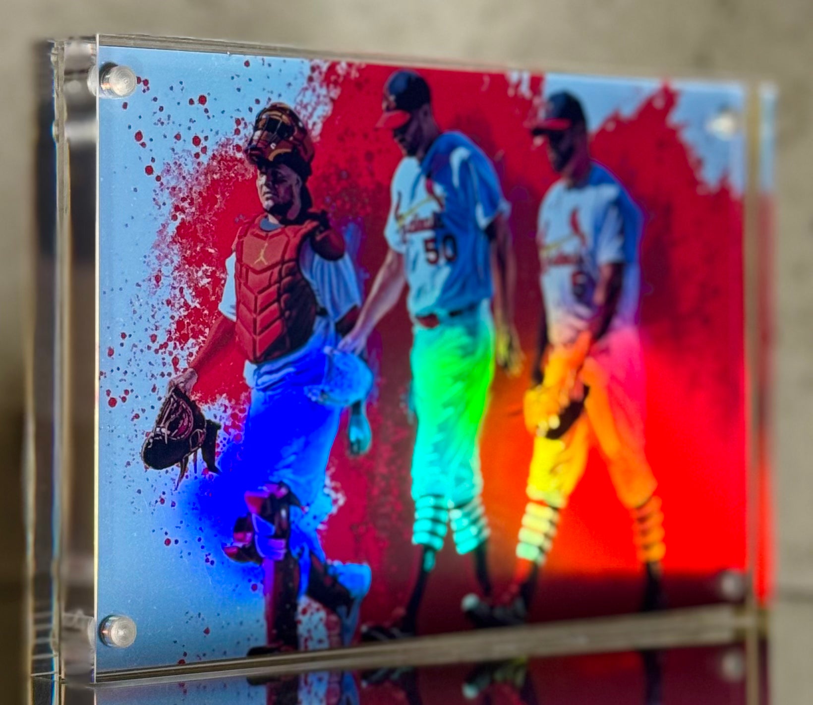 BLOX ARE HERE!! 4x6 inch collectible artwork produced on holographic film encased in an acrylic magnetic case. PERFECT as a gift for your favorite sports fan! Stack on your desk, bookcase or man cave. Each image is a limited reproduction of an original art piece created by Ken. Each piece has been hand drawn on illustration board or digitally painted as original artwork.