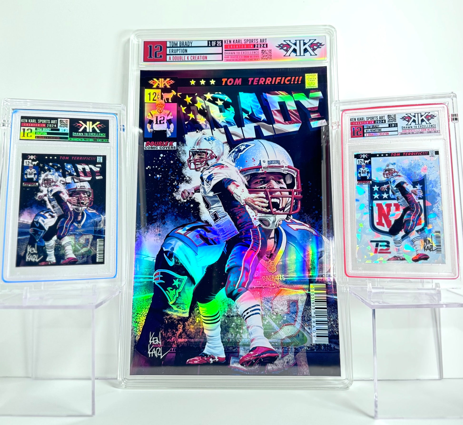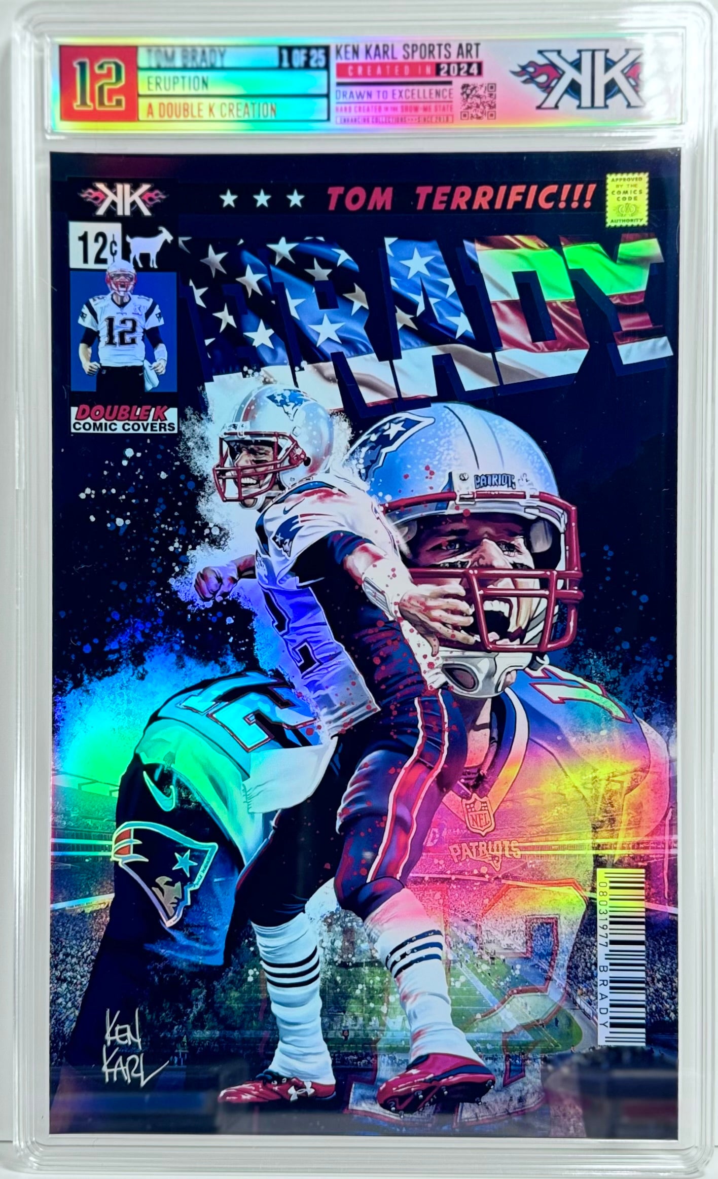 The GOAT, Tom Brady!! These are limited to just (25) Tom Brady Comic Cover Slabs. EACH comic sized slab is a holographic foil, signed by the artist himself. Ken has painted each image digitally using the art program Procreate. Each image is a reproduction on holographic film of an ORIGINAL work of art...These are not Photo-shopped images.
