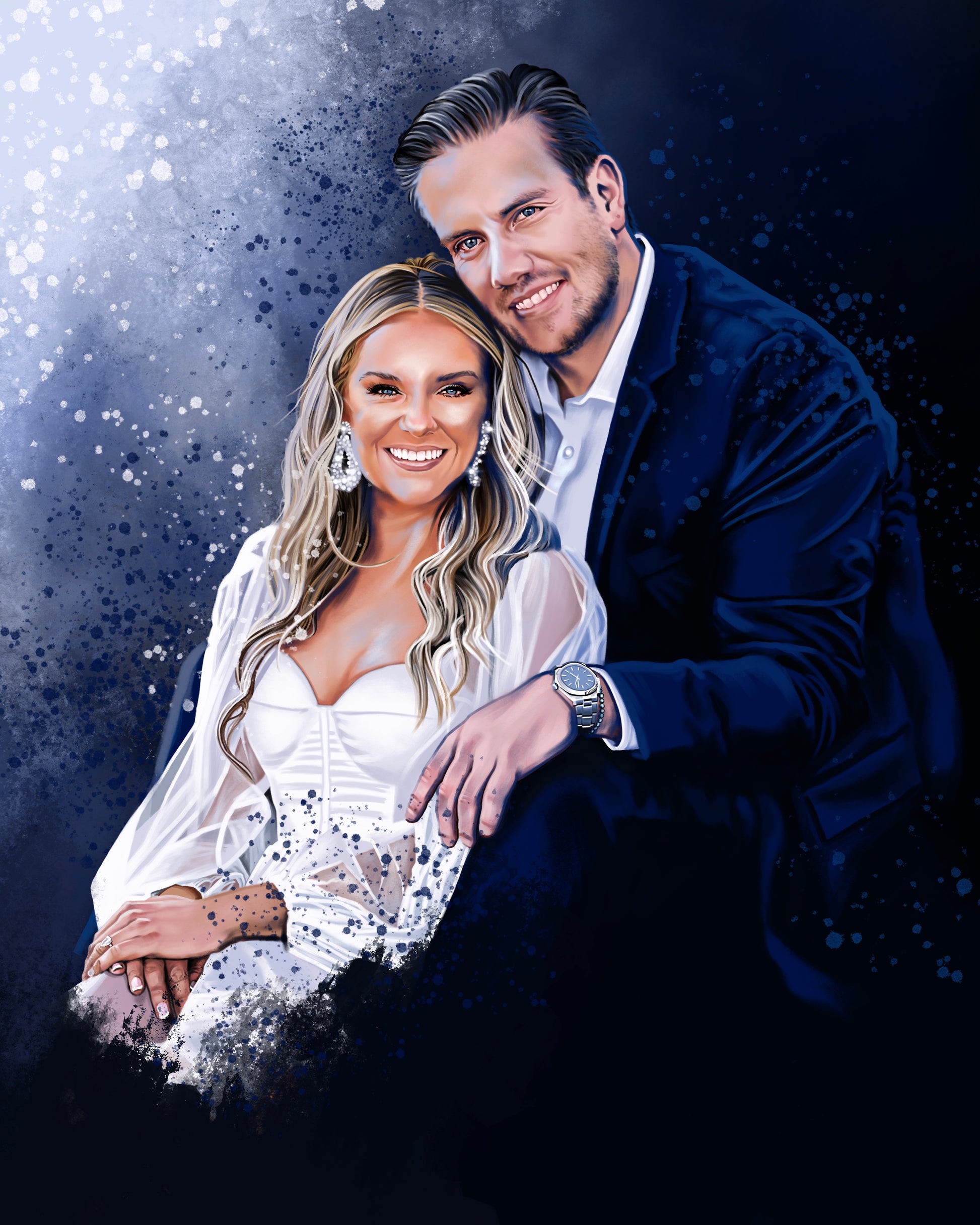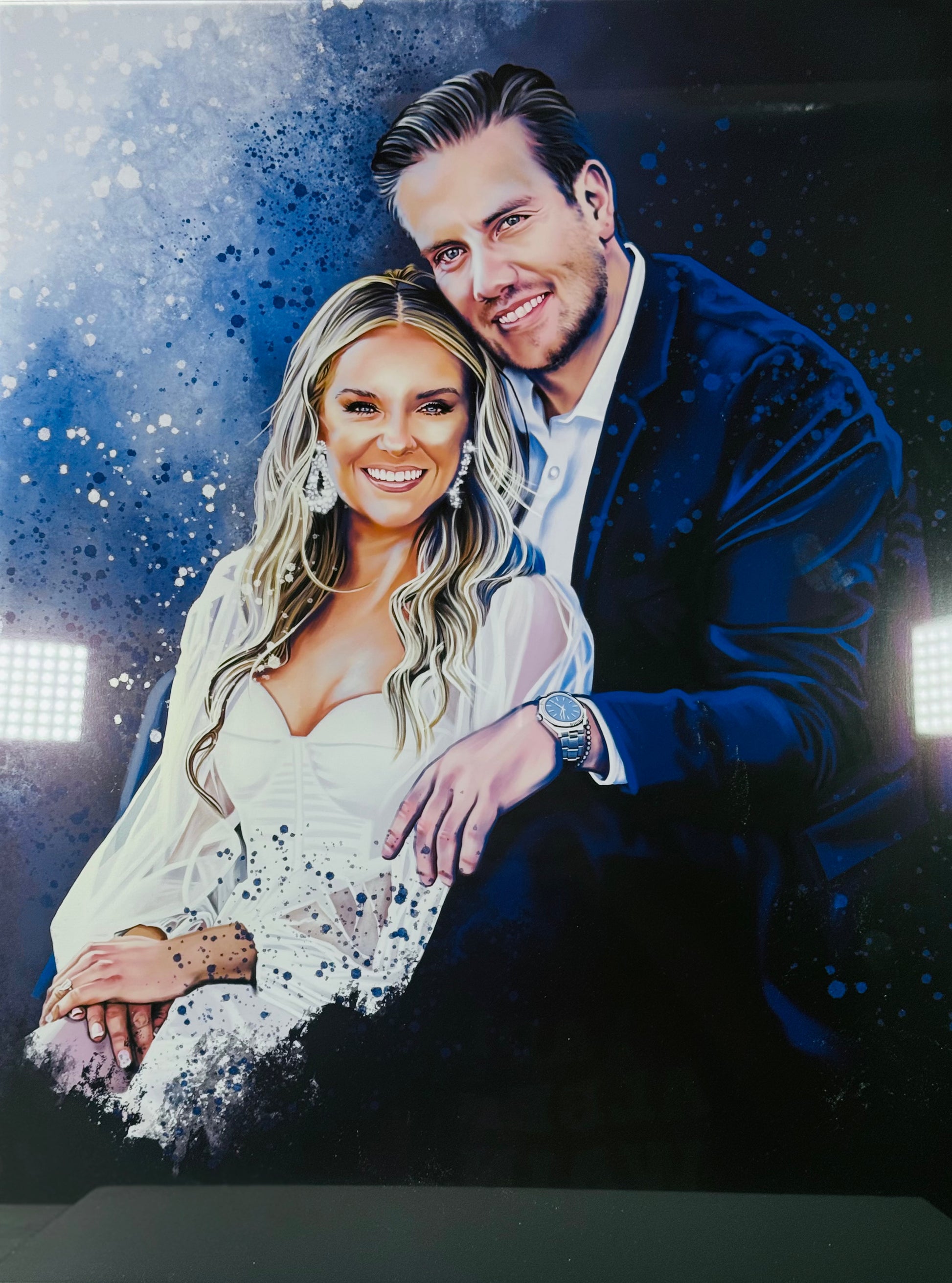 This beautiful couple was hand painted digitally using the paint program Procreate. It is painted using a digital stylus on an Ipad tablet. The final image, sized 18x24 inches was then output on ChromaLux aluminum sheets, printed with archival inks that are then infused directly into the aluminum shetlet film creating unsurpassed resolution and vibrancy. That vibrant sheet of color is then sealed behind a 1/4 inch sheet of clear protective acrylic. Ken did NOT use AI or Photoshop to create this image.